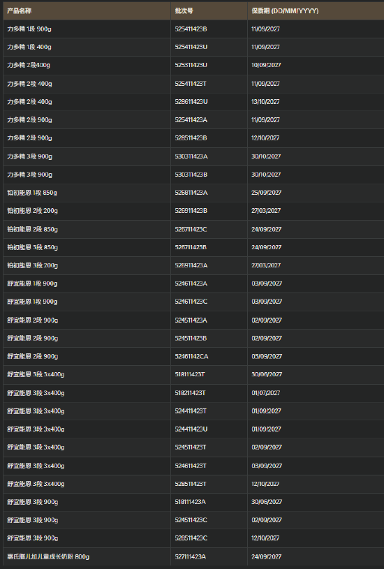 该公司同时公布了召回产品的图片和批次编号。这款奶粉在不同国家的商品名有所不同。