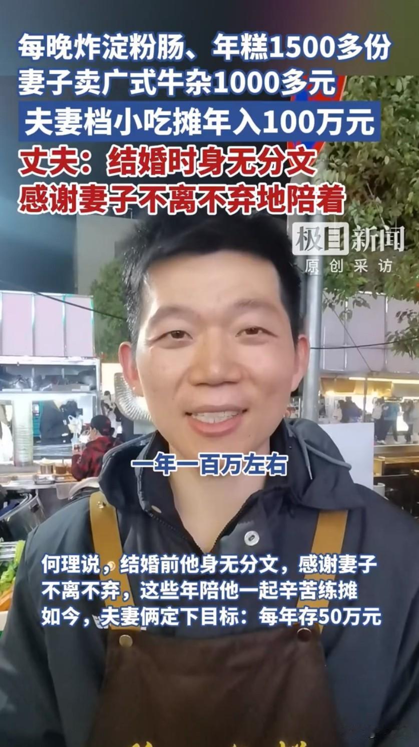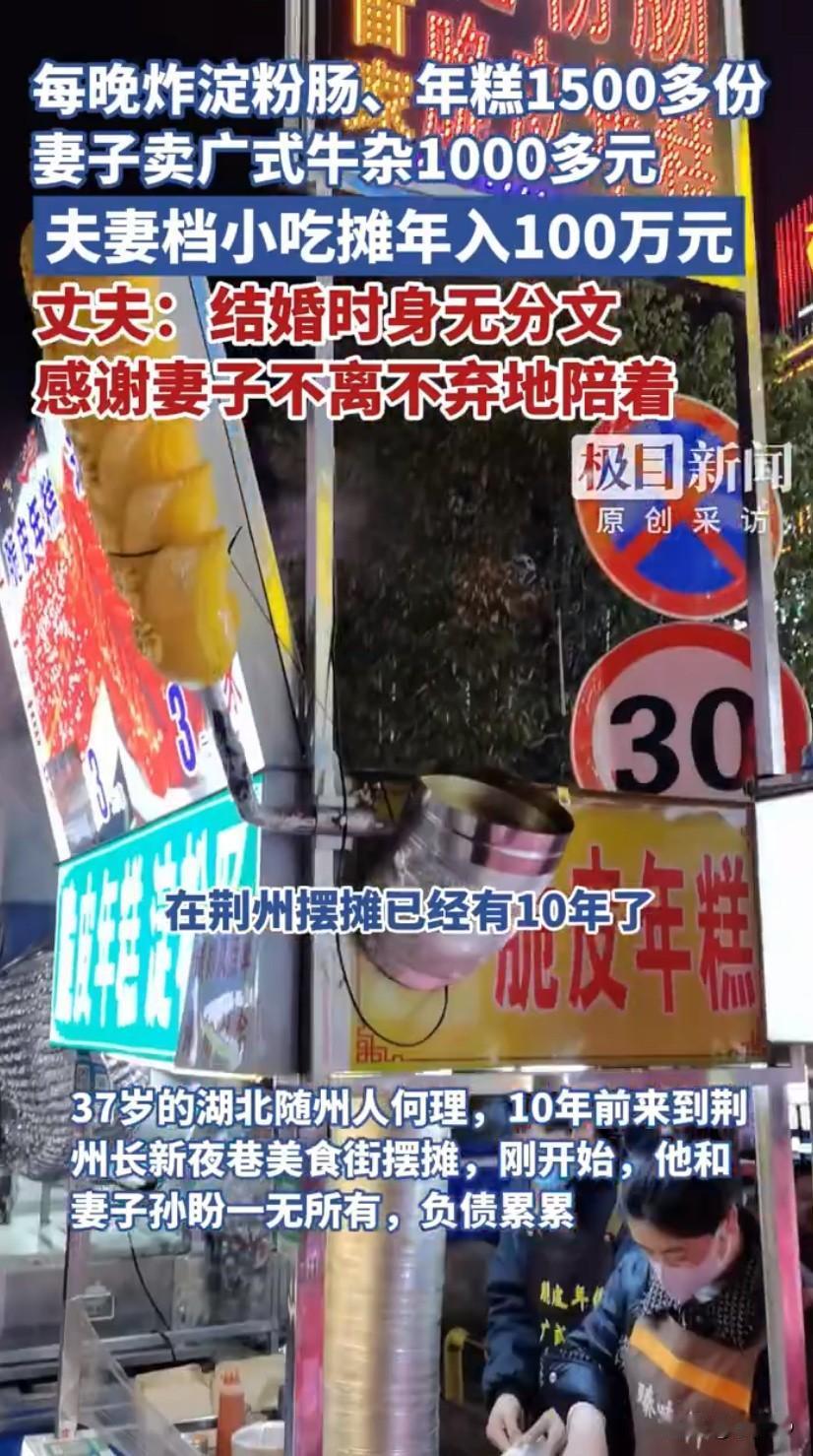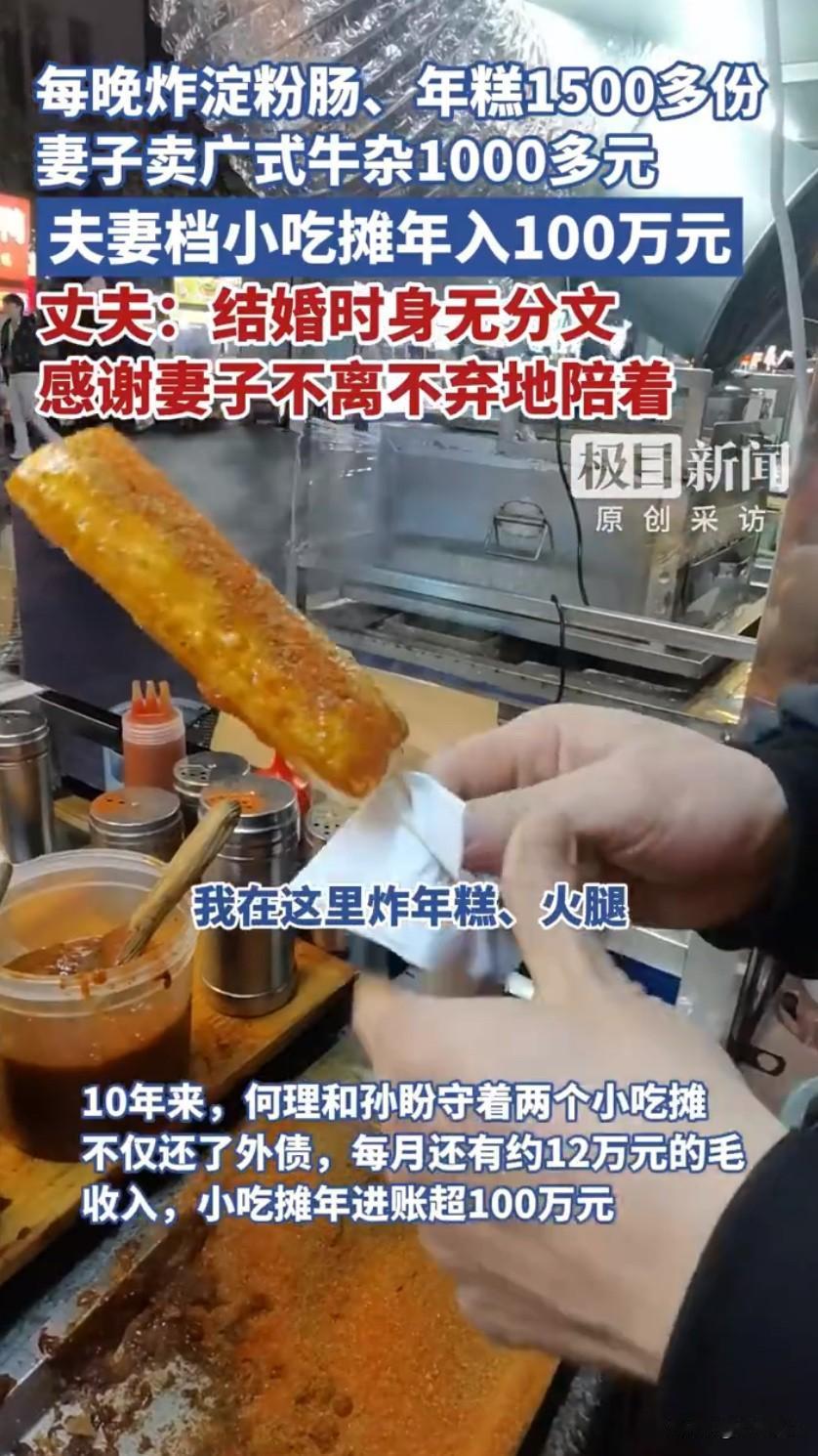 湖北夫妻炸年糕淀粉肠年入百万!10年打拼逆袭,每天忙16小时藏着致富密码! 家人们谁懂啊!湖北夫妻炸年糕淀粉肠年入百万 直接刷屏热搜,这对在荆州长新夜巷摆摊的夫妻,用一口油锅炸出了买房买车的好日子,网友看完直呼“原来普通人的致富路,藏在烟火气里”! 故事的主角是何理和孙盼夫妻俩,十年前他们还负债累累,父亲车祸花光积蓄,何理放弃浙江的厨师工作,带着妻子来荆州投奔堂哥,在高校旁的美食街摆起了小摊。一开始卖豆皮,每天凌晨四点就起床备货,忙到深夜十一点,一天才赚几百块,日子过得紧巴巴。直到后来摸清大学生口味,转型卖炸年糕和淀粉肠,生意才慢慢有了起色。 现在他们的小摊堪称“摆摊界天花板”,何理每天要炸1100多根淀粉肠、500多根年糕,右手手指因为常年颠漏勺,关节都肿大变形,老茧厚得能当砂纸,他却笑着说这是“搞钱的勋章”。最让人佩服的是他们的实在,炸过的油当天必倒掉,绝不重复使用,食材也都是新鲜备货,难怪学生们都说“何哥的油比脸还干净,吃着放心”。 他们能成功可不是靠运气,藏着实打实的“致富密码”。首先是坚守品质,炸过的油绝不留到第二天用,油锅永远清亮,老顾客都冲着这份放心来;其次是精准选址,美食街毗邻三万多学生的高校,客源稳定还自带传播力;更聪明的是多元经营,何理卖炸物,妻子孙盼在旁边开摊卖广式牛杂,一天也能赚1000多,俩摊位互相引流,风险也更低。 更幸运的是,美食街后来规范改造,300个固定摊位通过摇号分配,他们的两个摊位月租加起来才1100块,还配套了停车场、公共厕所和垃圾中转站。环境变好了,不光大学生来光顾,节假日还有外地游客慕名打卡,客流量直接翻倍,生意比以前更火爆了。 如今夫妻俩早就在荆州安家落户,买了房还添了车,专门用来送3岁的儿子上学,还定下了每年存50万的小目标。网友们纷纷感慨“没有随随便便的成功,他们的百万收入,是油锅里炸出来的,是起早贪黑拼出来的”,还有人说“这才是最真实的创业故事,踏实肯干比啥都强”。 这对夫妻的故事太励志了,没有一夜暴富的奇迹,只有日复一日的坚守。他们用实际行动证明,不管做什么行业,只要用心经营、守住品质,平凡的岗位也能创造不凡的价值。那些看似不起眼的烟火气里,藏着最踏实的幸福,也藏着普通人最动人的奋斗力量。 来源:极目新闻