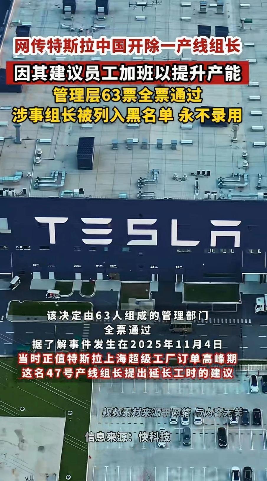 昨晚跟车企圈的朋友小聚,他抿了口酒就开始摇头感慨。 说刚爆出来的事儿,上海特斯拉超级工厂直接开了个产线组长,还终身拉黑永不录用,63人管理团队全票通过,一个反对的都没有。 你猜为啥?订单高峰期他想着邀功,提议让全组延长工时,结果直接踩了特斯拉的红线。人家第一条规定就是零容忍压迫同事,这组长想把国内这套卷王逻辑搬过去,直接踢到铁板上了。 最讽刺的是朋友补的一句,换国内某些车企,这组长说不定还能拿个“优秀管理者”奖状。之前媒体曝过,有的车企员工月加班200小时,还有强制896的,加班超20小时就给10块钱餐补。这对比简直扎心。 想想咱打工人天天被加班熬得直不起腰,难怪全网都站特斯拉。这组长本来想靠着加班博表现,结果弄成了职场笑话,估计以后圈内都没人敢收他。 你们身边有没有过这种为了讨好领导,逼着同事一起加班的组长?要是你遇到这种情况,会站出来吗