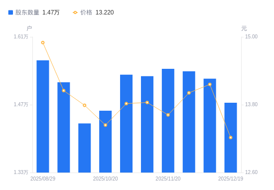 近一年(2024年12月20日至2025年12月19日),欣天科技A股股东户数从1.61万户,减低至1.47万户,降幅8.61%,区间股价下跌3.43%。