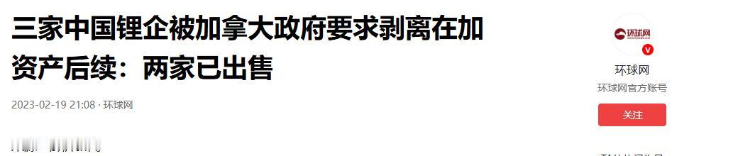 加拿大政府也以“国家安全”为由,全面禁止3家中企锂矿投资,并限期要求完成剥离。此举将直接切断了中企在北美关键矿产的布局。 这三家被点名的中企到底在加拿大投了什么?三家企业的投资都还处于早期勘探阶段,尚未形成实际产能。 其中,盛新锂能的投入相对最大,通过香港孙公司累计投资1.75亿元人民币,持有加拿大上市公司智利锂业19.35%的股权,成为其第一大股东,不过这家公司的核心项目其实在南美阿根廷,并非加拿大本土。 中矿资源则是用150万加元认购了加拿大动力金属公司5.72%的股份,还签了相关产品的包销协议。 藏格矿业的投资规模最小,以414万加元获得加拿大超锂公司19.47%的股份,成为第一大股东,涉及的项目也还在前期勘探阶段。 从这些数据能看出来,这些投资既不涉及成熟产能,也谈不上控制核心资源,所谓“威胁国家安全”的说法,实在有些站不住脚。 那么加拿大为什么要这么做?表面上看是拿“国家安全”当借口,实际上背后是地缘政治和产业竞争的考量。 随着新能源汽车、储能等产业的爆发,锂作为“白色石油”,已经成为各国争抢的战略资源。加拿大自身锂加工能力几乎为零,但它想在全球新能源产业链中占据一席之地,而中国目前控制着全球三分之二的锂提炼产能,是全球最重要的锂加工和消费市场。 在这样的背景下,加拿大跟着美国的步伐,把经贸问题政治化,试图通过限制中企投资,为自己的产业发展铺路,同时制衡中国在新能源产业链中的主导地位。 就在禁令发布前一周,加拿大刚出台了针对外国企业投资关键矿产的新规,对外国国企的投资进行严格限制,这一系列操作显然是早有预谋,是其推行贸易保护主义的具体体现。 这场禁令带来的影响,远比想象中更复杂,而且最终很可能是“双输”的结果。对三家被点名的中企来说,短期影响有限,因为涉及的项目都还在勘探阶段,没有产生实际收益,剥离投资不会对公司业绩造成重大冲击。 中矿资源和盛新锂能很快就完成了股权出售,藏格矿业后续也完成了处置。但从长远来看,这无疑给中企海外投资敲响了警钟,让中国企业在布局北美关键矿产时多了一层顾虑,不得不重新评估投资风险。 对加拿大而言,损失可能更长远。中国是全球最大的锂消费市场,也是最成熟的锂加工基地,加拿大强行切断与中企的合作,相当于主动放弃了资金和技术支持,自家的锂矿资源开发进度很可能因此放缓。 这种出尔反尔的做法会损害其国际信誉,让其他国家的投资者对加拿大市场望而却步。原本中加在资源领域有很强的互补性,中国需要资源,加拿大需要市场和资金,现在因为政治操弄,这种互补优势被白白浪费了。 从全球产业链来看,加拿大的做法也破坏了供应链的稳定性。全球矿产资源产业链的形成是市场规律和企业选择的结果,强行用行政手段进行切割,只会增加产业成本,阻碍新能源产业的发展。 中国外交部当时就明确回应,加方的做法违背了市场经济原则和国际经贸规则,敦促其停止对中国企业的无理打压。 事实上,中国企业也在积极调整布局,把目光更多投向南美、非洲等地区,寻找更稳定的合作伙伴,而加拿大则很可能在这场资源竞争中错失发展机遇。 在全球化时代,任何试图通过贸易保护、政治操弄阻碍产业合作的行为,最终都会搬起石头砸自己的脚。锂资源的竞争本质上是产业实力的竞争,靠限制投资、封锁技术是行不通的。 只有坚持开放合作,尊重市场规律,才能实现互利共赢,这也是全球新能源产业健康发展的必然要求。