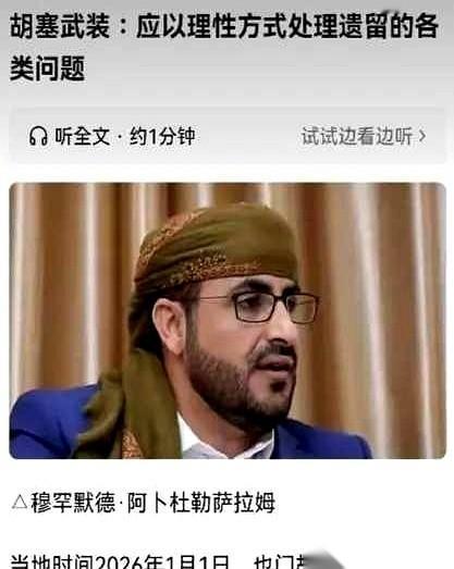前几天还咋咋呼呼,恨不得把红海当自家澡盆的胡塞,怎么突然哑火了?还开始喊着要“理性处理问题”。 2025年最后那几周,胡塞还在红海把商船当“移动靶”,无人机、导弹轮番招呼,喊着“为加沙而战”的口号,活像把这条全球12%贸易要冲当成了自家后院泳池。 但到了2026年1月1日,发言人穆罕默德·阿卜杜勒萨拉姆突然换了腔调:“得用理性处理遗留问题”,连沙特封了好几年的萨那机场都成了他喊话的重点——这反差,堪比前脚还在跟人拍桌子,后脚就递上了保温杯。 这事儿的根子,其实是“队友”先崩了。过去十年沙特拉着阿联酋搞的“反胡塞联盟”,去年底彻底露了破绽:阿联酋偷偷给南方过渡委员会塞武器,沙特直接炸了穆卡拉港的运兵船,俩海湾大佬当场撕破脸。紧接着阿联酋宣布从也门撤军,等于把沙特独自扔在了对抗胡塞的前线。 胡塞眼尖,立刻看明白:以前是一对多,现在变成沙特单练,这时候喊“理性”,等于给沙特递了个台阶——毕竟沙特打了十年仗,钱没少花,边境还总被炮弹砸,早想找机会下台阶了。 更现实的是“家里的事儿”不能不管。 胡塞控制的也门北部,萨那机场关了好几年,荷台达港的物资进不来,老百姓连面粉、药品都缺得厉害。联合国说这里70%的进口靠这个港,现在港口被炸得半残,再硬撑下去,自己地盘里的怨气就得压不住。 阿卜杜勒萨拉姆讲话里特意提“集体惩罚”,其实是在说:“别光盯着加沙,咱也门人的日子也得过”——毕竟手里攥着地盘,得先把自己人喂饱,不然口号喊得再响,后院也得着火。 还有个藏在台面下的算计:伊朗那边跟胡塞通了气。 有消息说,伊朗革命卫队的人跟胡塞开了秘密会,核心就一个:别把劲儿使太猛。现在以色列和美国盯着伊朗,要是胡塞把红海闹得太凶,等于把自己变成“靶子”,提前耗光了手里的牌。 不如“梯度升级”——先喊和平,等对方放松了再找机会,既不让自己被集中打击,还能接着拿加沙当“道德buff”。 当然,胡塞也没真“哑火”。 就在喊话的同时,他们还在红海盯着商船,只是没以前那么高调。这种“边喊和平边攥拳头”的操作,其实是把“理性”当工具:对外能缓解国际压力——毕竟联合国天天催着解救人道危机,对内能稳住北部民心,顺便还能离间沙特和其他海湾国家。 现在的也门,活像个拆了一半的积木:胡塞占着北部,也门政府守着碎块,南方过渡委员会还喊着“独立公投”。 胡塞这声“理性”,更像在乱局里抢话筒:你们南边打得鸡飞狗跳,我这儿要搞和平,谁是“稳定派”一目了然。 至于这和平能持续多久?不好说——毕竟胡塞以前也演过“先谈后打”的戏码,但至少眼下,红海的浪头暂时小了点,萨那机场的大门,好像也露出了条缝。
