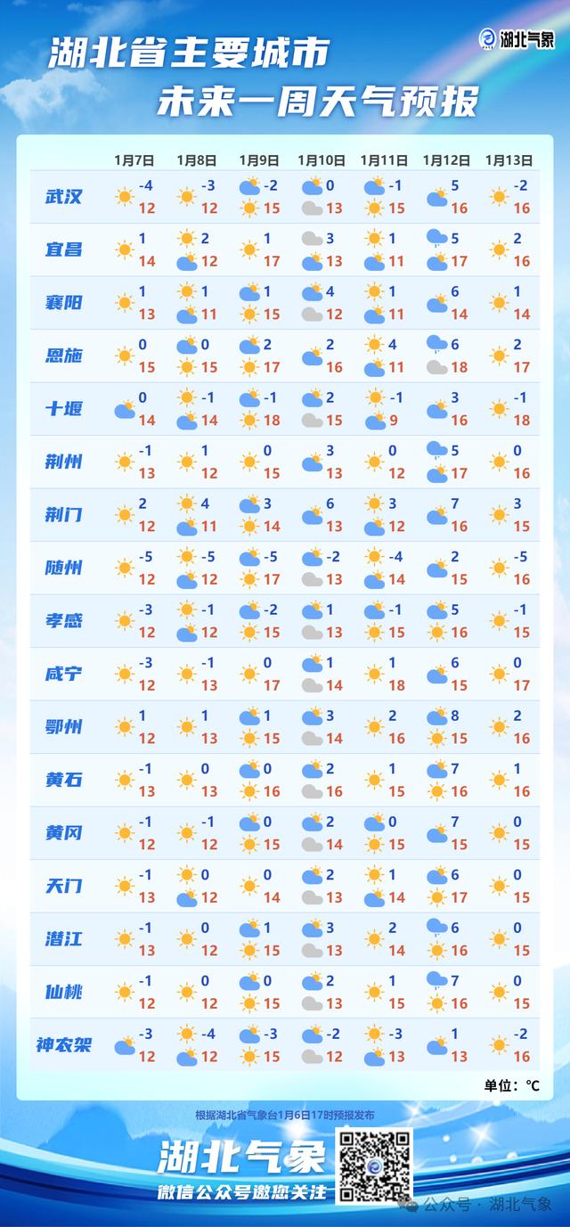 1月7日08时-8日08时,全省多云到晴天。最高气温11~15℃,最低气温北部-6~-2℃、南部-2~2℃,偏北风2到3级、阵风4到6级。