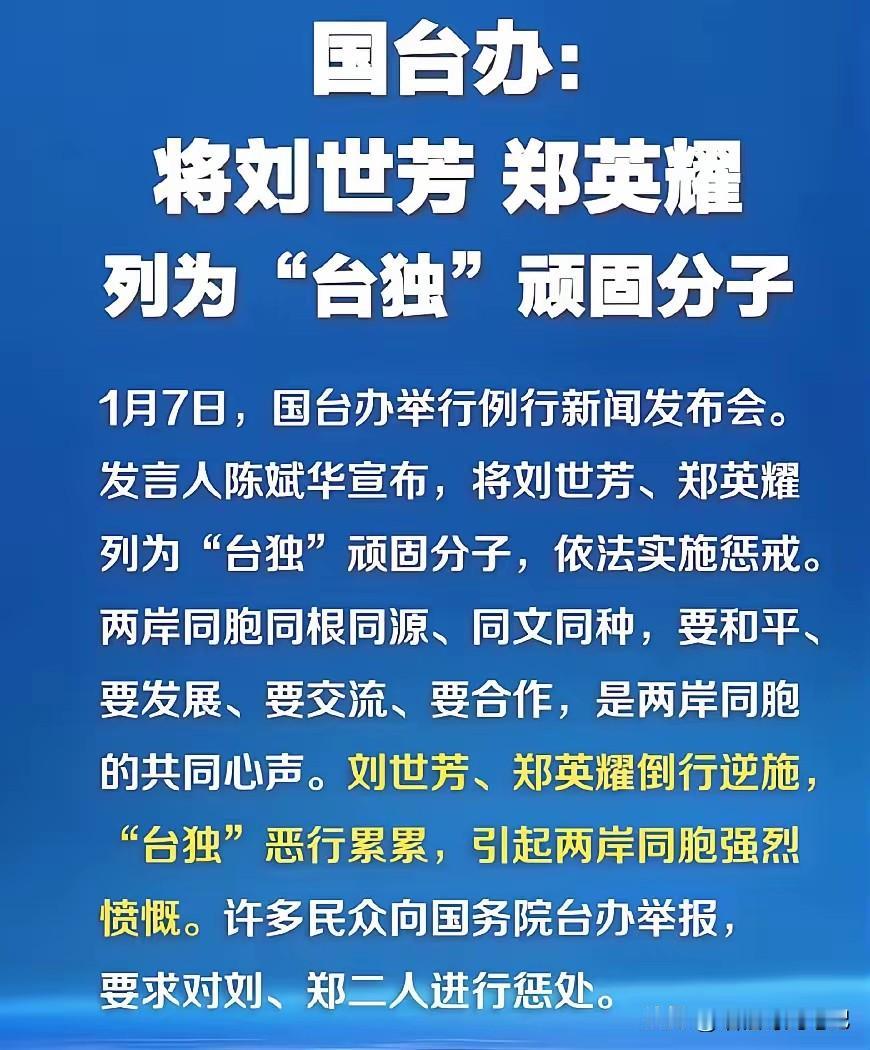 今天,国台办把台内务部门负责人刘世芳、教育部门负责人郑英耀正式列为“台独”顽固分子,并祭出“终身追责”制裁。 因为这两人的“罪行”不是政治口水,而是实打实把黑手伸向了普通人: 刘世芳:大陆配偶被无故遣返、两岸婚姻“卡关”、民间交流动辄被“反渗透”调查,台湾内部举报信箱塞满冤案,她却把举报信当“功绩”。司法成了“台独”打手,法律尊严碎了一地。 郑英耀把“去中国化”教材化:组织编写“一边一国”读本,小学课本里删掉《静夜思》、把郑成功叫“外来政权”,大学研讨会禁止大陆学者视频参会。知识殿堂变成“洗脑工厂”,台湾孩子一出生就被人为制造“认知敌国”。 两人一边喊“抗中保台”,一边把家属、金主公司悄悄注册在第三地,继续赚人民币。台独是门生意,孩子与平民才是“人质”。 此次制裁:禁止本人及家属进入港澳、冻结关联企业在大陆谋利空间,并全球征集违法线索——“终身追责”四字,等于把“台独”做成永不翻身的“国际通缉套餐”。这不是“打压”,而是给两岸同胞一个交代:谁破坏和平,谁就得付出终身代价。 历史早已证明,台独不是“爱台”,而是“害台”。当课本删除李白、司法抛弃公义,台湾不会更“独立”,只会更孤独。今天这份清单,是对倒行逆施者的当头棒喝,也是对岛内沉默大多数的一声提醒:继续纵容,下一代将失去整个未来。 「图源网络」
