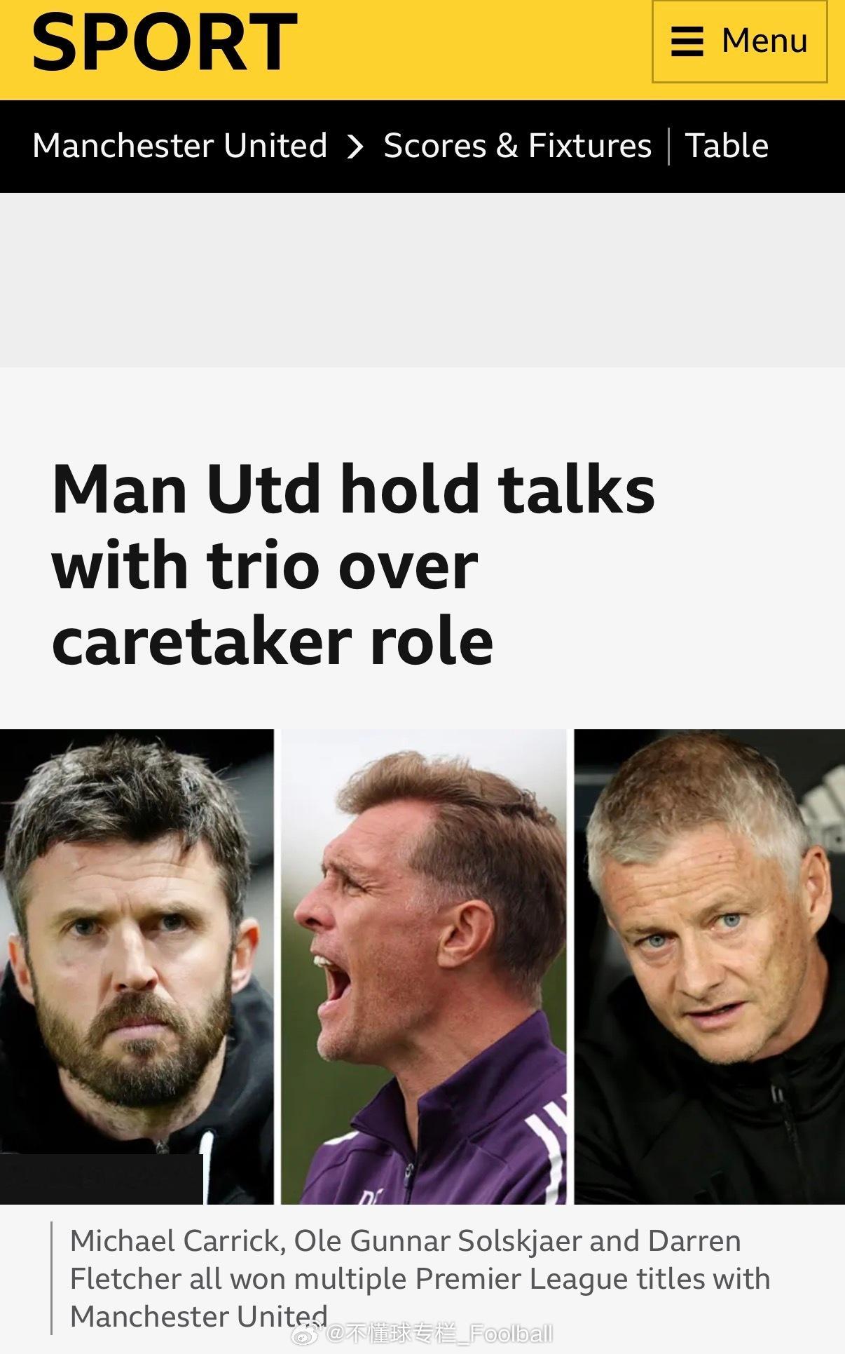 James Ducker:索夏、卡里克和范尼都是曼联看守主帅位置的竞争者。今天上午弗格森现身训练场,与贝拉达和威尔考克斯喝了咖啡。Simon Stone确认了同样的消息。Alex Crook说索夏得到了球队传奇和一线队球员的支持。曼联英超联赛