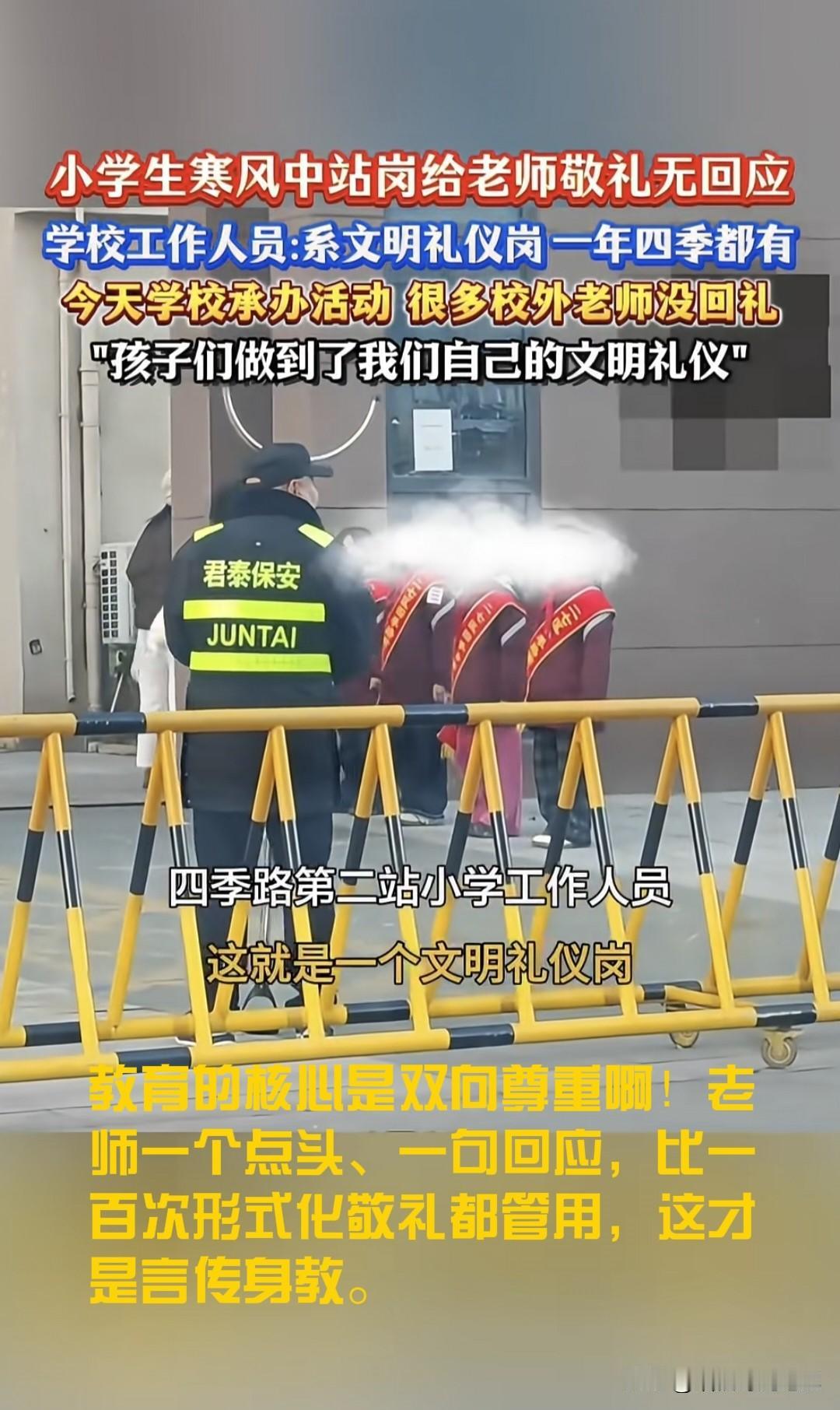 一张图:清晨,寒风中某小学门口,值日生笔直敬礼,老师低头刷手机,擦肩而过,零回应。 当孩子把腰板挺成小白杨,眼含敬意,抬手一个敬礼,清脆的喊:“老师好!”换来的却是视若无睹,那份纯真,若被空气吞掉,再滚烫的真诚也会漏掉几分温度。 也许,老师他们正急着去上课、手里抱着作业,或者担心车在校门口多停两秒就违规,本质上也成了死板制度的“背锅人”。 我看到有网友留言:“孩子就该锻炼,别玻璃心。”可我觉得真正的历练,是告诉他:世界偶尔冰凉,但总有人为你点一盏灯;而不是让他一开始就相信,灯永远不会亮。别小看这0.5秒的“回礼”太小。它会悄悄在孩子心里埋下一粒火种,等他哪天撞见善意,是张开手迎上去,还是抱着肩躲开来,就看这粒火有没有被风吹熄。 真正该被拉到聚光灯下的是流于形式的校园管理!把礼仪课浓缩成“到岗打卡”,只要学生单方面输出礼貌,却不给师生双向回馈的清晰示范,更不顾严寒、车流、安全这些现实变量,这不是育人,是摆拍。 教育的根本,是彼此尊重。老师一个轻轻的点头、一句简单的回应,胜过一百次走过场的敬礼,这才是真正的以身作则。别让孩子的真心变成“表演”,也别让老师在规矩中进退两难。把仪式还原成心与心的交流,那才是校园应有的温度。 「图源网络」