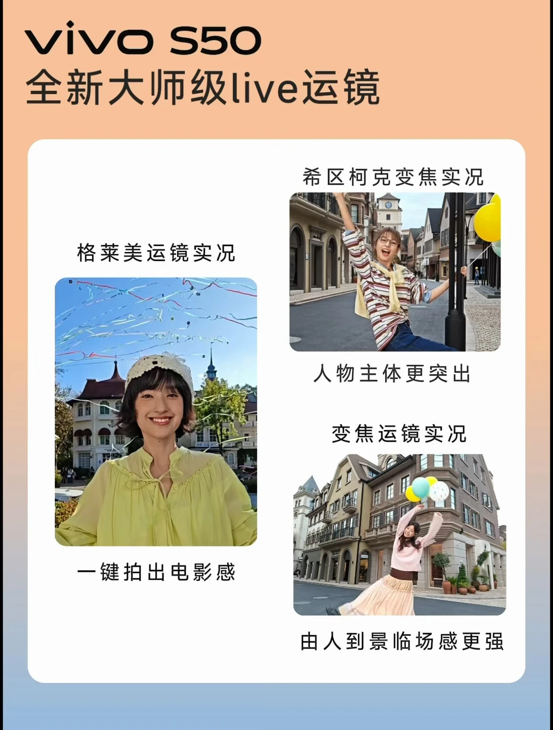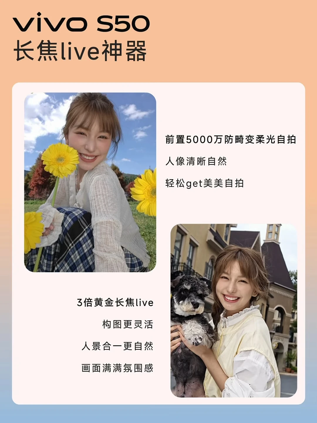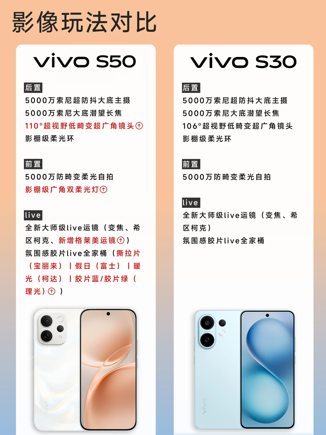 两手机都是前置5000万像素,后置5000万主摄 + 5000万潜望长焦。S30拍照很稳,日常记录ok,S50的优势在算法优化,夜景和长焦更扎实。它有主摄级长焦live,配合【格莱美】【希区柯克】【变焦】运镜,可以拍出大片感的效果。氛围胶片live全家桶,随手一拍就是故事感,适合爱拍照记录生活的朋友。