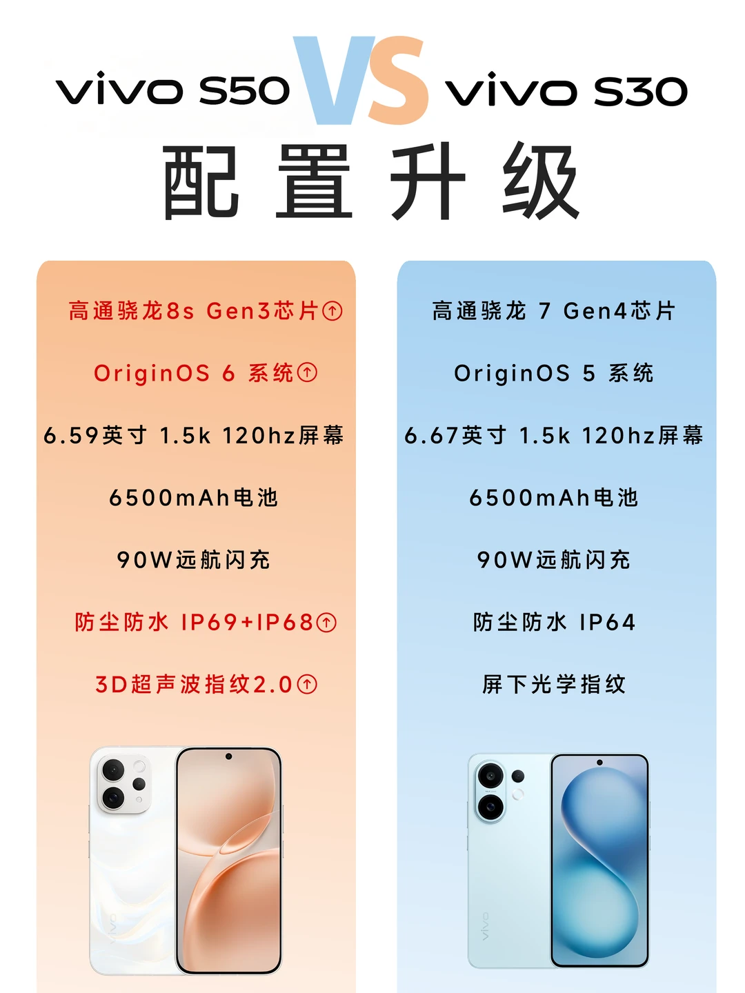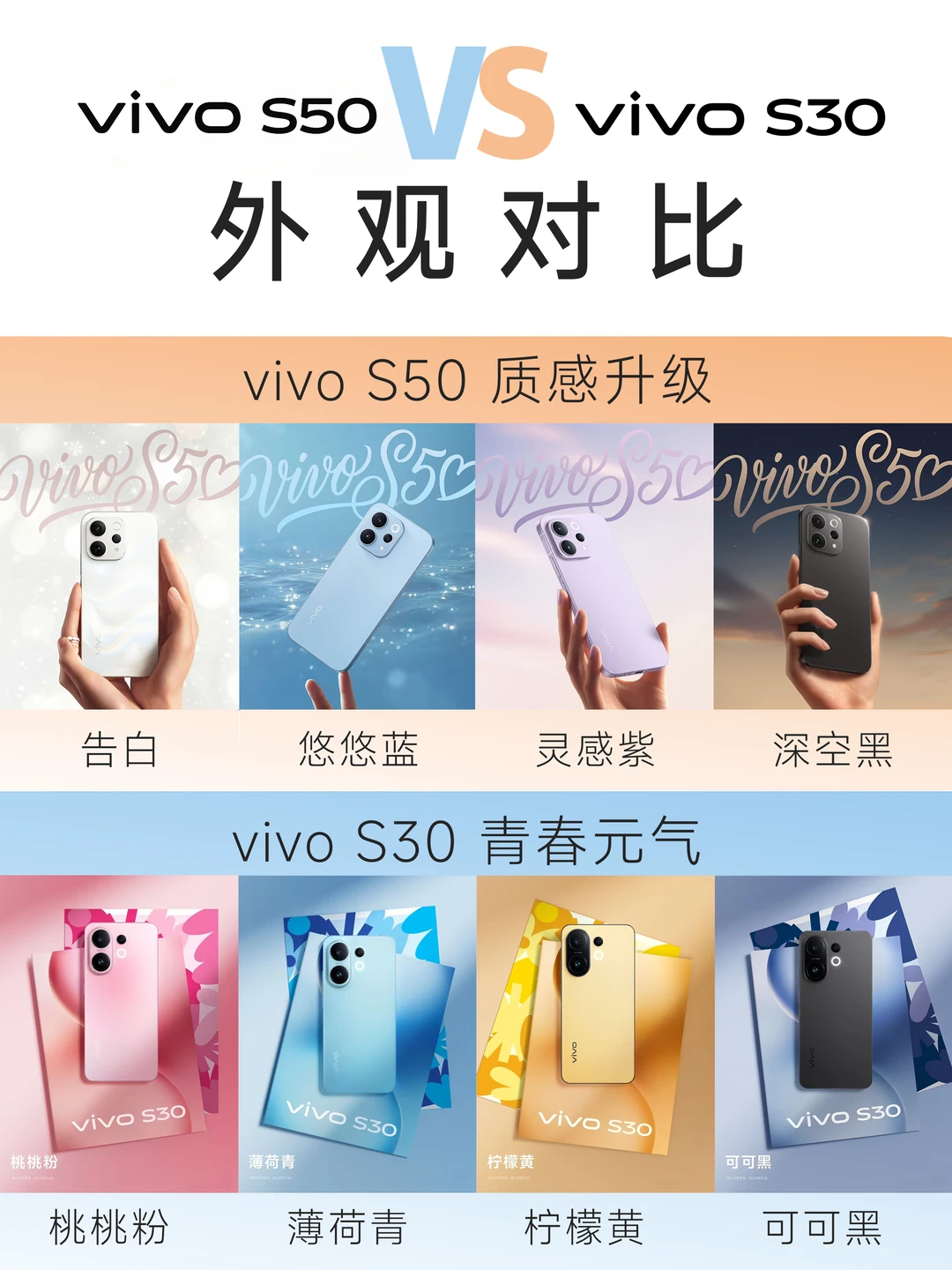 S50在S30的基础上,多了超声波指纹、更好的长焦人像效果和旗舰芯片。预算吃紧选S30;想体验旗舰配置,追求出片影像,预算充足闭眼冲vivo S50!