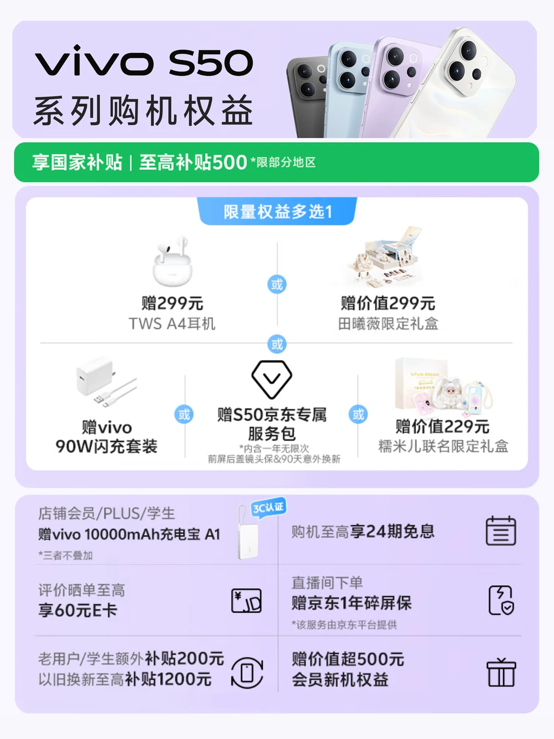 去vivo京东自营旗舰店入手S50系列有24期免息,送价值299的TWS耳机,或者田曦薇、糯米儿礼盒以及vivo原装充电宝。这波福利加上15%的国补真香!