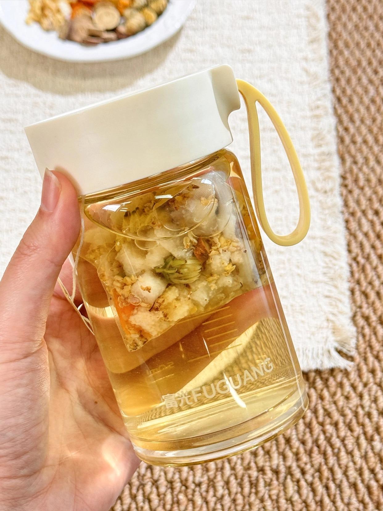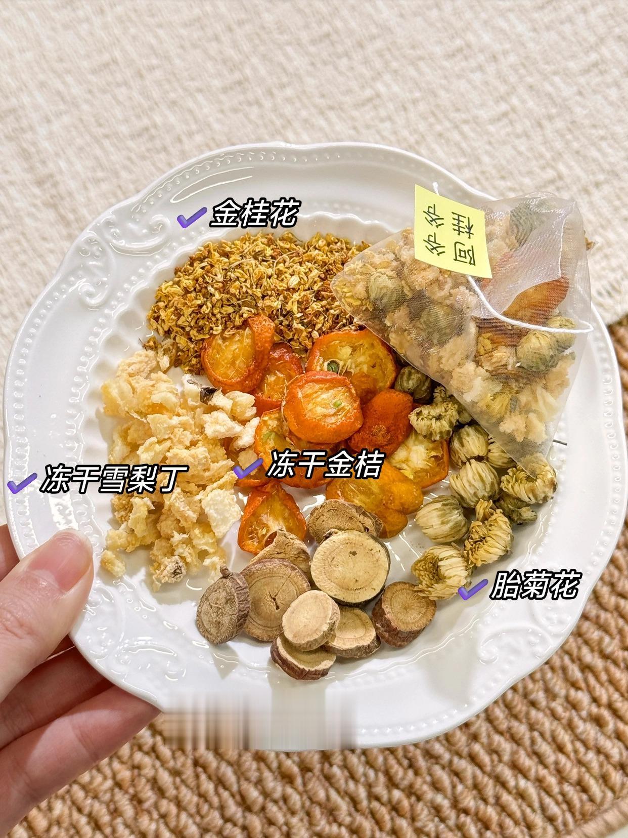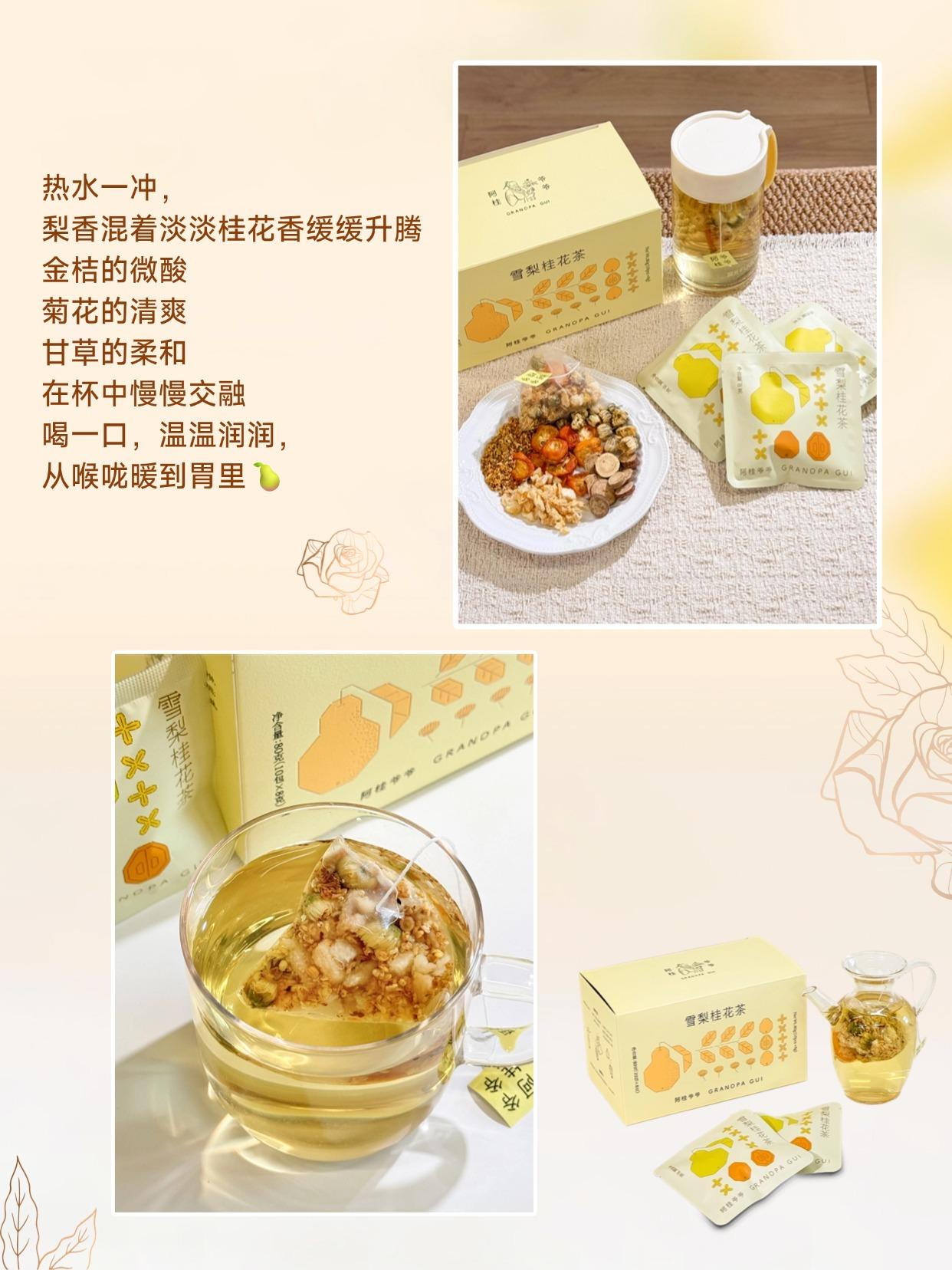 冬天皮肤干燥不适,养生多喝雪梨桂花茶。冬日天气干燥+暖气房待久了 脸和嗓子都干得不行…… 这时候泡一杯温润的雪梨桂花茶 整个人都被温柔地包裹住了✨ 打开茶包那一刻就安心—— 全是看得见的食材本尊: ✔️冻干雪梨丁✔️金桂花✔️冻干金桔✔️胎菊花✔️甘草 热水一冲,梨香混着淡淡桂花香缓缓升腾 金桔的微酸、菊花的清爽、甘草的柔和 在杯中慢慢交融 喝一口,温温润润,从喉咙暖到胃里🍐 没有额外加糖,也没有香精或多余添加 就是食材本来的味道 每天下午泡一杯,甜甜润润的很舒服