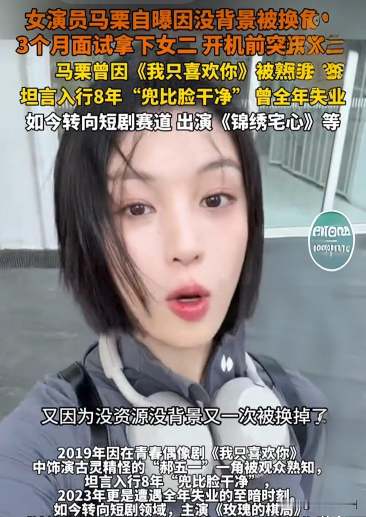 因《我只喜欢你》走红,3个月拿下女二却开机前被换,入行8年“兜比脸干净”! 说出来你可能不信,最近有个事儿在演员圈里炸了——曾靠《我只喜欢你》被观众记住的马栗,自曝苦熬3个月面试来的女二角色,竟在开机前突然被替换!理由更扎心:“没背景”。入行8年,她笑着说自己“兜比脸干净”,这话里藏了多少无奈?今天咱就聊聊光鲜镜头背后,那些没人敢轻易揭开的真实。 你可能还记得她演过的程小娜,灵得很。为了拿下那部戏的女二,马栗整整三个月反复试镜、揣摩角色,导演组都夸她“贴脸”。眼看就要开机了,团队连妆造方案都对接完了,结果一个电话打来:“抱歉,有了更合适的人。”什么叫“更合适”?后来业内朋友悄悄点了一句:人家带资进组,你有吗? 这行就这样,表面看是个名利场,背后全是现实账。马栗不是没熬过——曾经一整年没戏拍,卡里余额常年不超过五位数,但她从不爱拿这些说事儿。她在直播里语气很淡:“很多机会不是努力就能碰到边儿的,它有一道‘背景门槛’。”这话一出,弹幕里飘过无数“懂了的”和“哭了”。谁不是在职场里碰过壁?只不过演员的壁,往往镀着金,更硬,更凉。 但故事没停在委屈里。现在的马栗,转身扎进了短剧赛道。她主演的《锦绣宅心》口碑不错,新戏也一部接一部。她说:“纠结过去没意义,能抓住的才是自己的舞台。”你看,现实也许冰冷,但总有人能在裂缝里重新生根发芽。 所以啊,你们觉得在职场里,“背景”和“实力”到底哪个更重要?有没有哪次,你明明拼尽了全力,却还是输给了“关系”?来评论区聊聊,你的故事,也许正是别人走出迷茫的那束光。 女演员马栗自曝被换角 没有背景的人怎么闯 短剧逆袭
