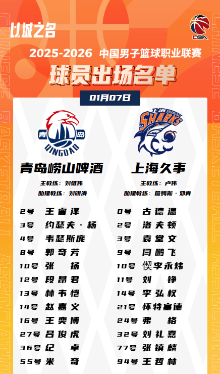 虎扑01月07日讯今晚CBA常规赛,青岛对阵上海的大名单已经公布。
