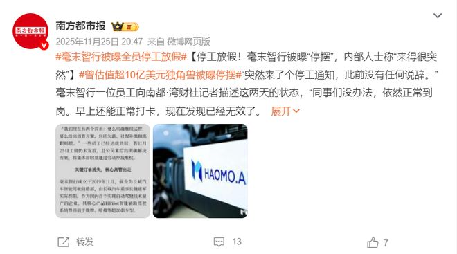 2025年末,长城汽车投资的智驾公司——毫末智行更陷入“全员放假”传闻。据媒体报道,11月22日,还在上班的毫末智行员工却突然接到了《停工放假通知》,要求“自2025年11月24日起,公司及分公司全部在职员工停工放假”。彼时,毫末智行工作群的在职员工人数还有不到300人。这一人数与2021年9月对外披露的“毫末在职员工已经超过500人”相比,减少了接近一半。