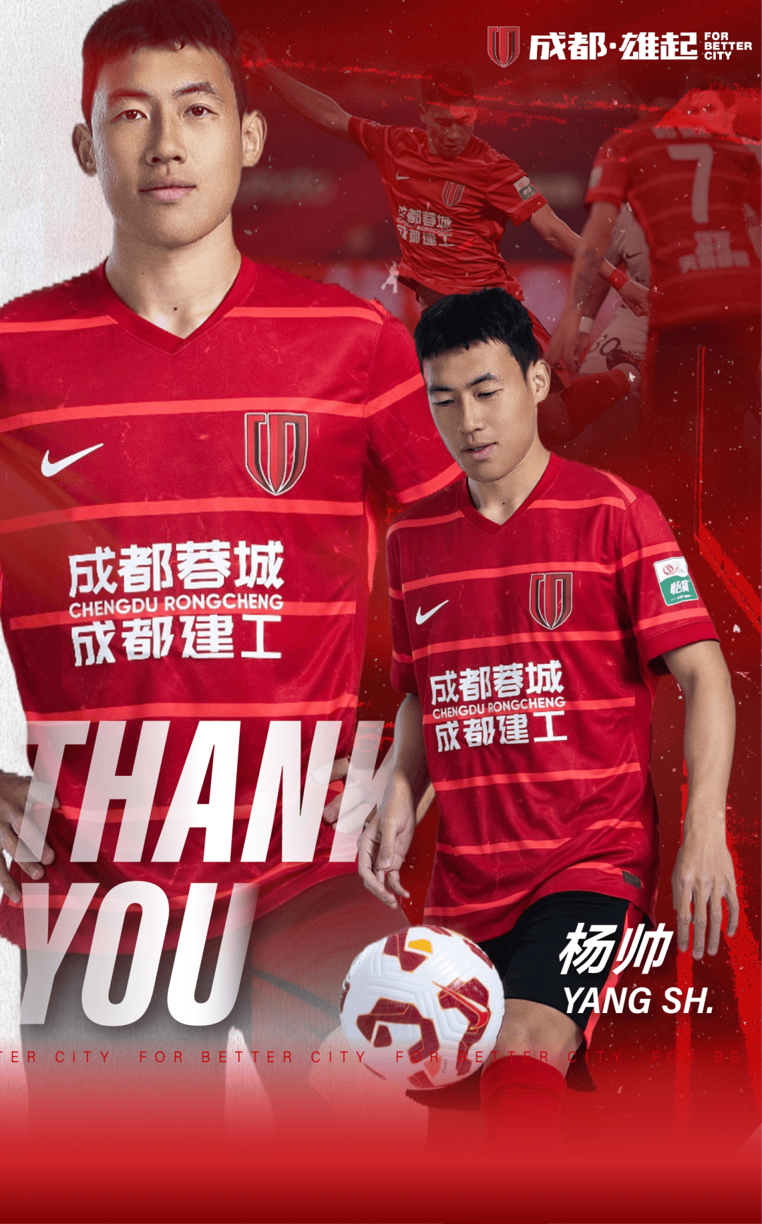 经与球员本人友好协商并达成一致,杨帅与成都蓉城足球俱乐部的合同到期不再续约。