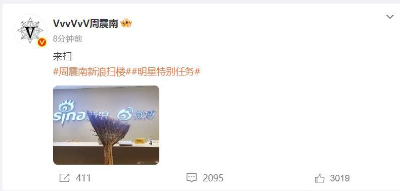 周震南让你扫楼不是扫楼 顶流秒变保洁员?周震南把扫楼玩出新花样,拎扫把站新浪前台