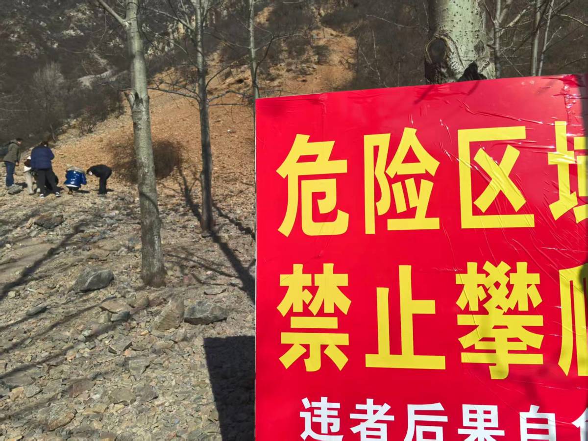 顺着游客指引的方向往山脚赶,记者很快看到了那处被管控的陡坡——坡面近乎垂直,其上布满了裸露的碎石堆,原本密密麻麻在石堆中翻找的人群已不见踪迹。几名身着深色外套的男子站在陡坡下方的安全区域,对着试图往坡上走的游客高声劝阻:“上面石头松动,有落石危险!赶紧往安全的地方退!”声音穿透山间的风,反复提醒着往来人员。
