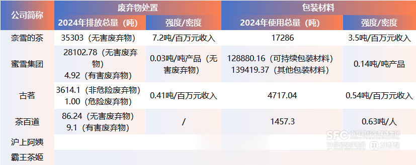 那么,新茶饮企业的固废治理披露情况如何?在上述6家新茶饮企业中,仅沪上阿姨和霸王茶姬未披露废弃物和包装材料相关的定量数据。蜜雪冰城、茶百道、古茗和奈雪的茶已全部完成披露。