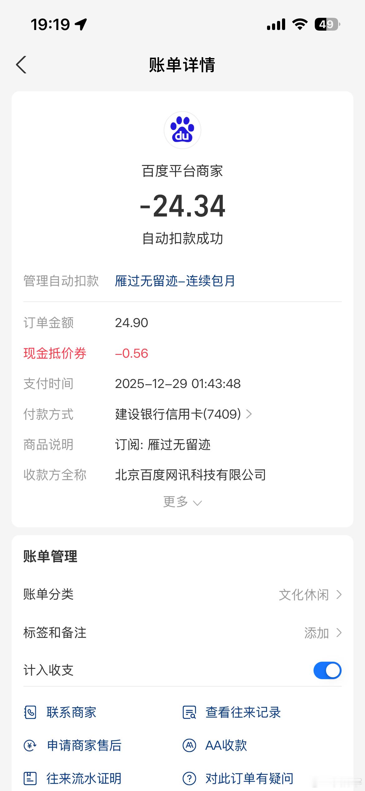 本人通过百度看了一篇文章,为了看完,支付了1.99元,月底自动变成了自动续费扣款