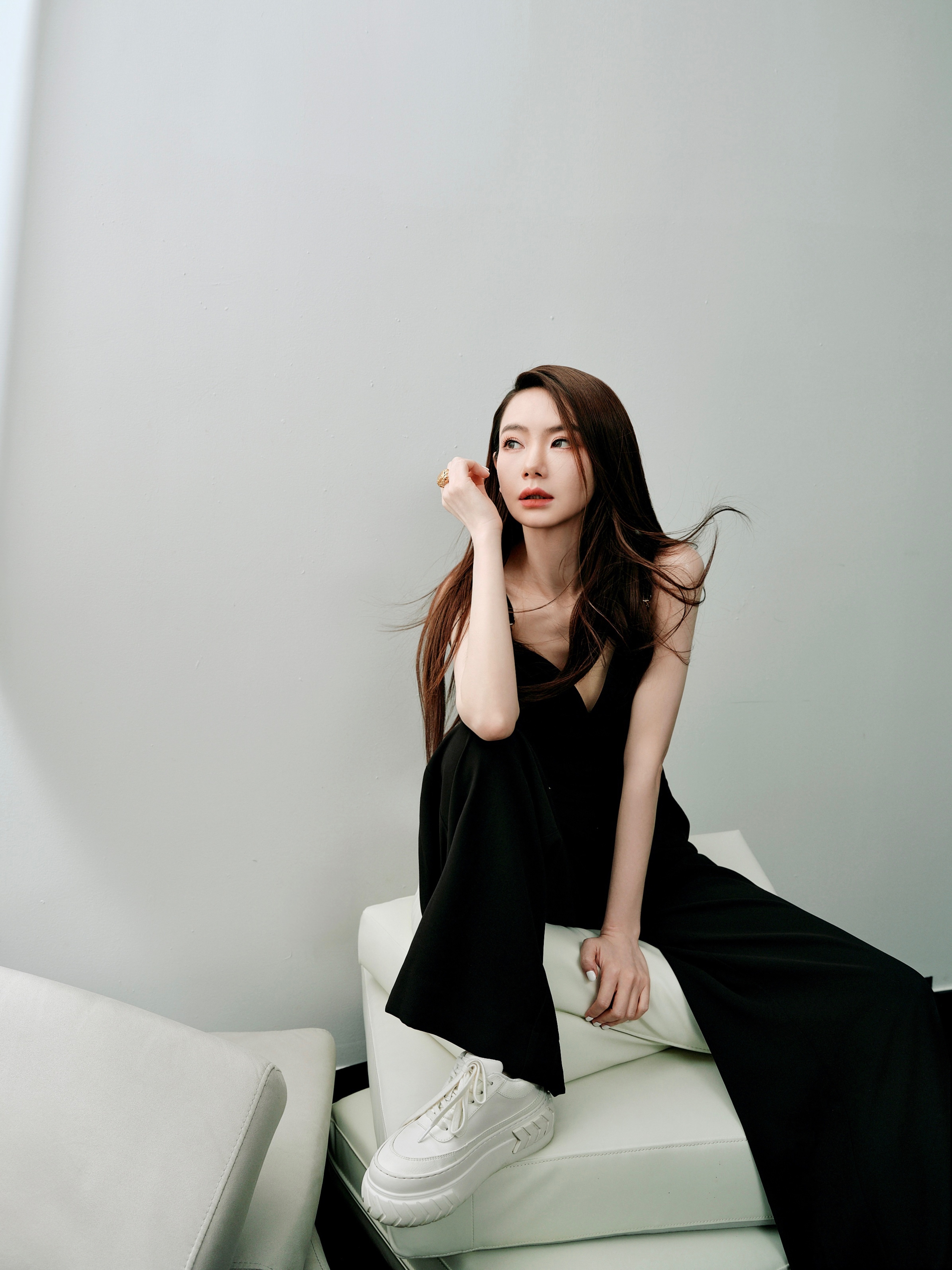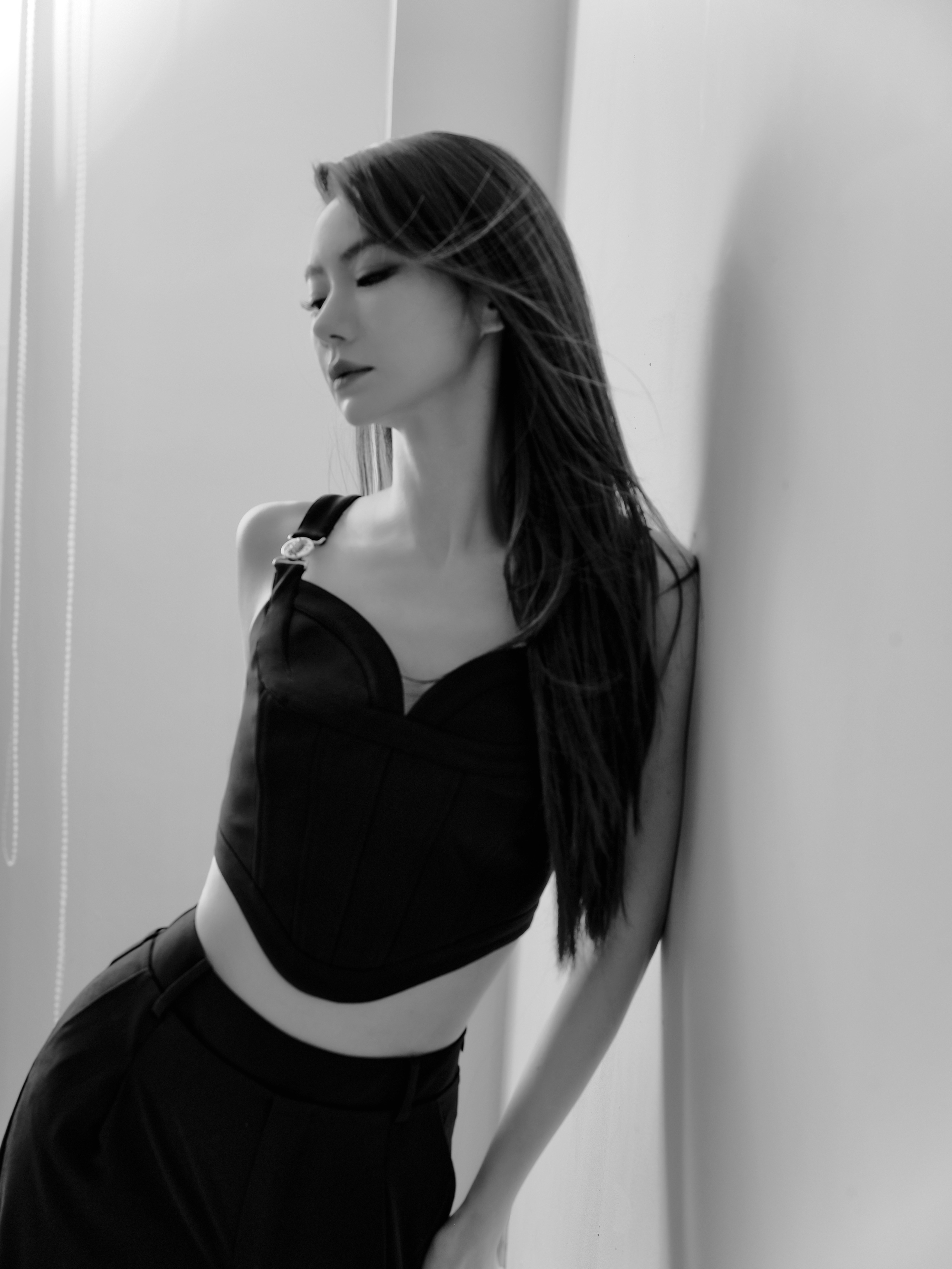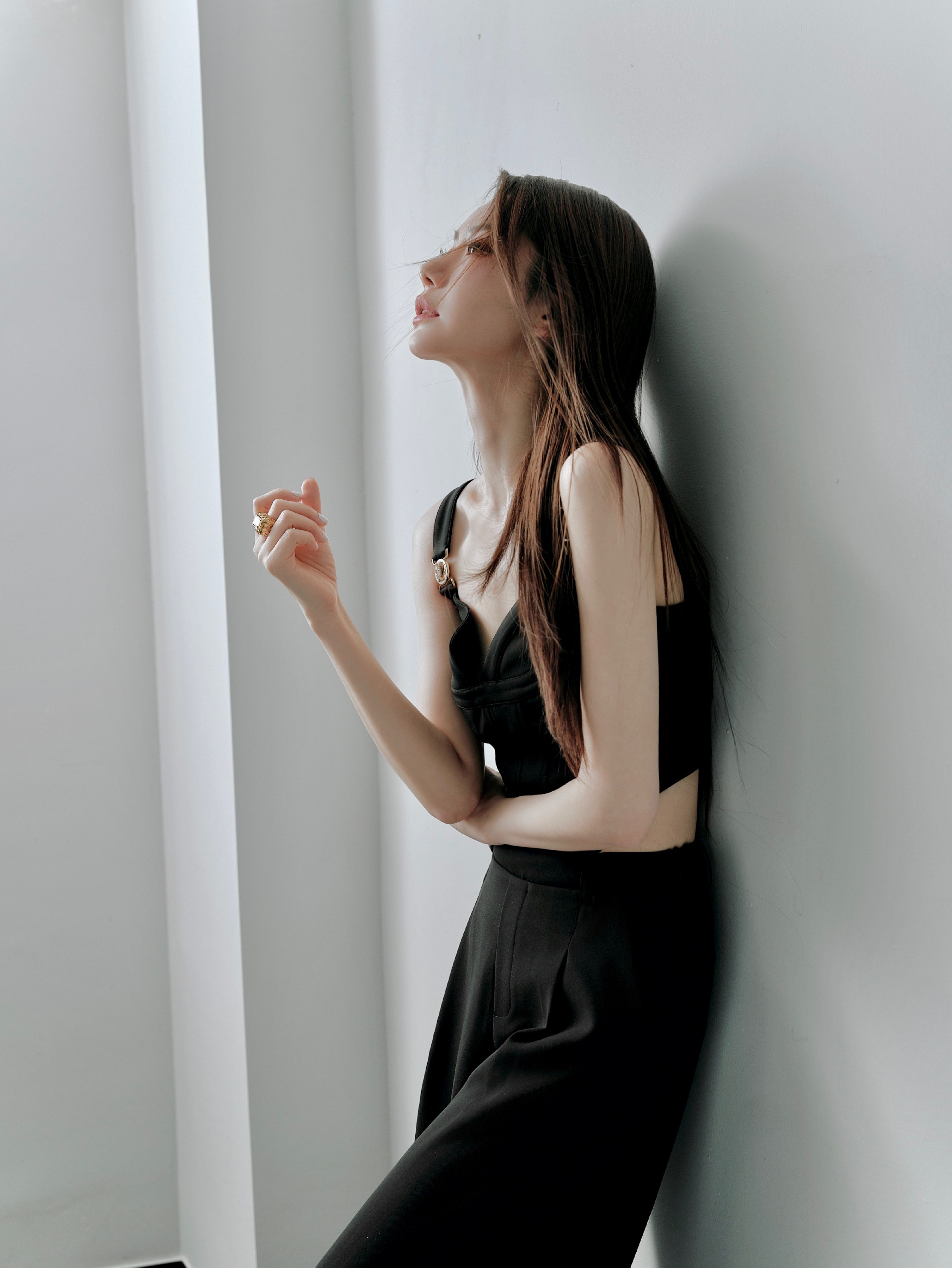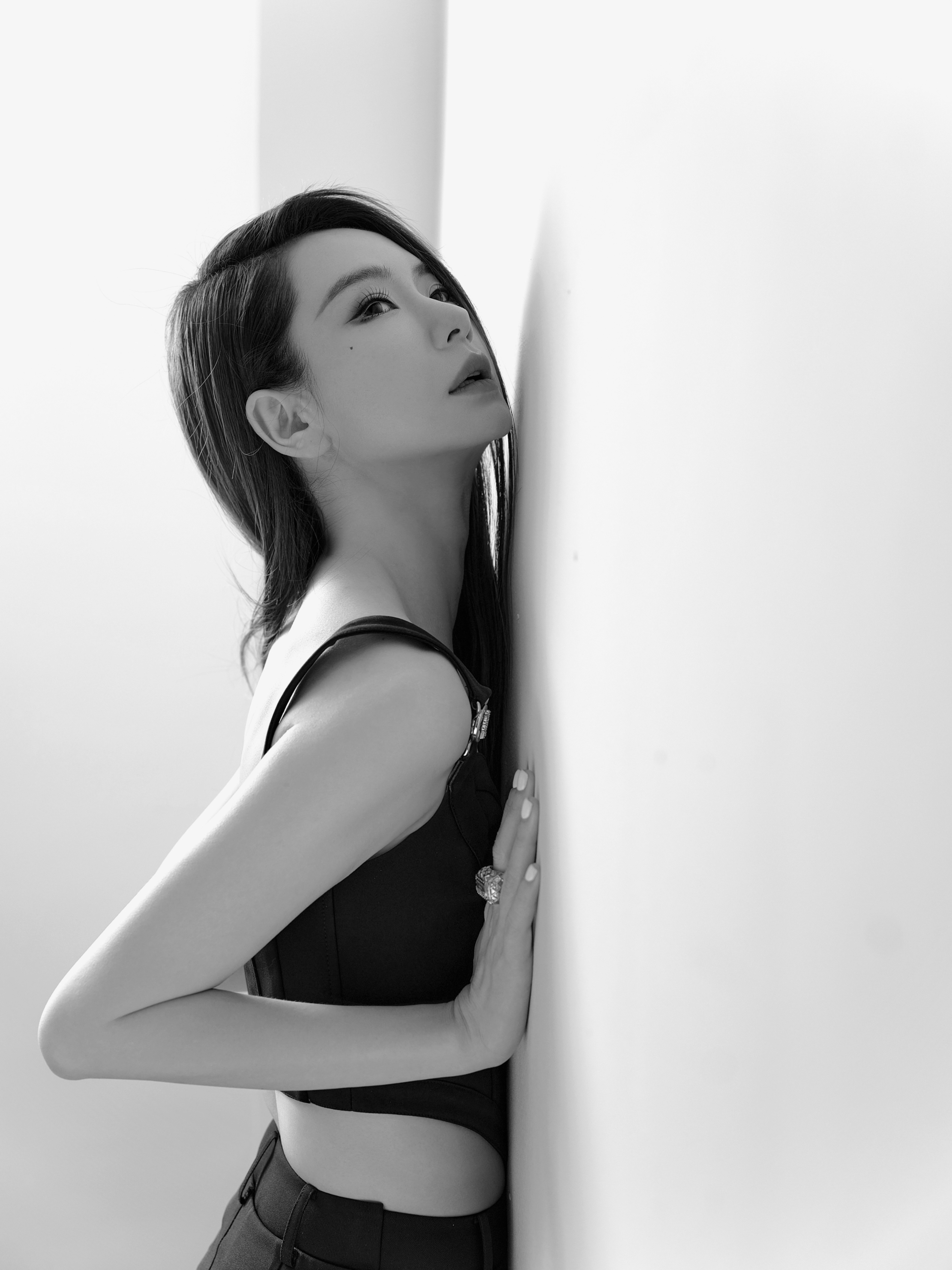 戚薇,长发黑衣,飒爽柔美。戚薇