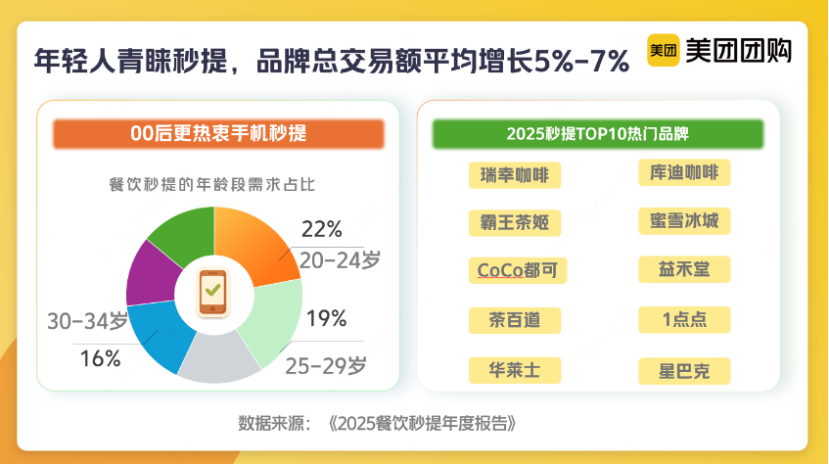 2025年,年轻人成为秒提消费主力军。《秒提报告》显示,20岁至24岁、25岁至29岁、30岁至34岁的用户下单量占比分别是22%、19%、16%。秒提品类选择上,茶饮更受青睐,2025年,用户通过秒提下单了约10亿杯茶饮。