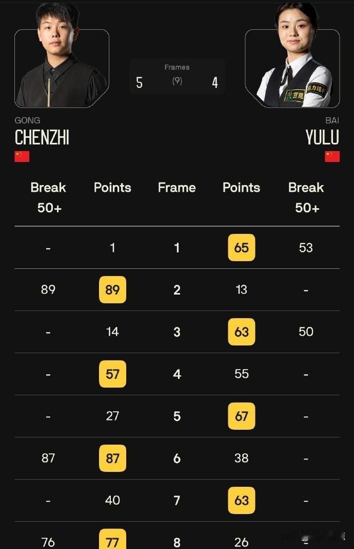 中国斯诺克15人出战9人晋级!江俊横扫,白雨露惜败 凌晨三点,空气都带着点冷劲儿,但比赛还热着。德国大师赛资格赛的战火从1月5日一路烧到了7号凌晨,中国军团15位球员轮番上阵,最后9人杀出重围,6人遗憾止步。这数字看着还行,可过程真不是每个人都能扛得住。 江俊那场打得真是痛快。5-1收拾了乌姆特,节奏压得死死的。第一局上来就88-10赢下,第二局人家乌姆特刚上手扔了16分,他直接一杆78分收走。第三局对手打了48,眼瞅着要起势,他又是一杆68,硬生生摁了回去。第四局单杆51,74-18再拿,一口气4-0进休息室。说实话,这种开局基本等于宣布比赛结束。第五局他倒是松了劲,失误开始冒头,让乌姆特60-35扳一局。可第六局立马清醒,几杆零敲碎打,88-0锁死,干净利落。 赵瀚洋那场就完全是另一种滋味。新人转正,第一轮碰上哈里斯,心里压力肯定有。开局还行,66-24拿下首局。第二局他单杆51眼看要稳,结果被哈里斯后程发力,总分84翻盘。接着人家连轰两杆50+,3-1领先进中场。回来赵瀚洋靠一杆58扳回,可第六局又被拿下,4-2落后,眼瞅着要被淘汰。这种时候能顶住的人不多,但他真咬住了,连赢三局,一波3-0逆转,5-4活生生把门票抢到手。不容易,新人就该这么拼。 白雨露那场看得人有点揪心。对巩晨智,她打得一点不差,首局单杆53分先拔头筹。第二局对手89分还回来,第三局她又是一杆50,2-1占先。第四局57-55,被人家极限反咬,2-2平。休息回来,她第五局67-27、第七局63-40,两次上手拿分,看起来稳了。可巩晨智那两杆真硬,第六局87分,第八局76分,直接拖进决胜局。最后一局磨得跟拉锯战似的,多次上手,白雨露拿了39分,但巩晨智慢慢堆到63,5-4带走胜利。差一点,真的就差一口气。 王雨晨更可惜。4-2领先,三个赛点在手,结果达赫迪突然爆发,一杆破百、两杆50+,连赢三局,5-4完成逆转。这种翻盘,打的不只是技术,是心理。你领先的时候放松一丝,对方就能把节奏全抢走。 再往前推,1月5日那批人打得其实挺稳。高阳5-1霍尔沃斯,常冰玉5-1奥利弗·布朗,黄佳浩5-3吉米·怀特,傅家俊5-1许医尘,清一色拿下。也就姚朋成4-5输给阿贾布,刘文炜2-5不敌阿尔特米,早早出局。第二天下午那场,张家玮5-1吴安仪,蓝裕豪5-3托顿,也都顺利过关。 到了凌晨三点,第二轮开打,只剩两人的内战,高阳对阵国强。当时比分是高阳4-3领先,后面还没打完,悬念留着。这种自家兄弟拼,压力也不小,谁都不想输给同胞。 整个资格赛看下来,有横扫,有逆转,有惜败,也有崩盘。9人晋级,不算差,但每一场背后都是实打实的较量。江俊稳,赵瀚洋韧,白雨露拼到了最后一秒,王雨晨倒在黎明前。接下来的路,还得自己走。