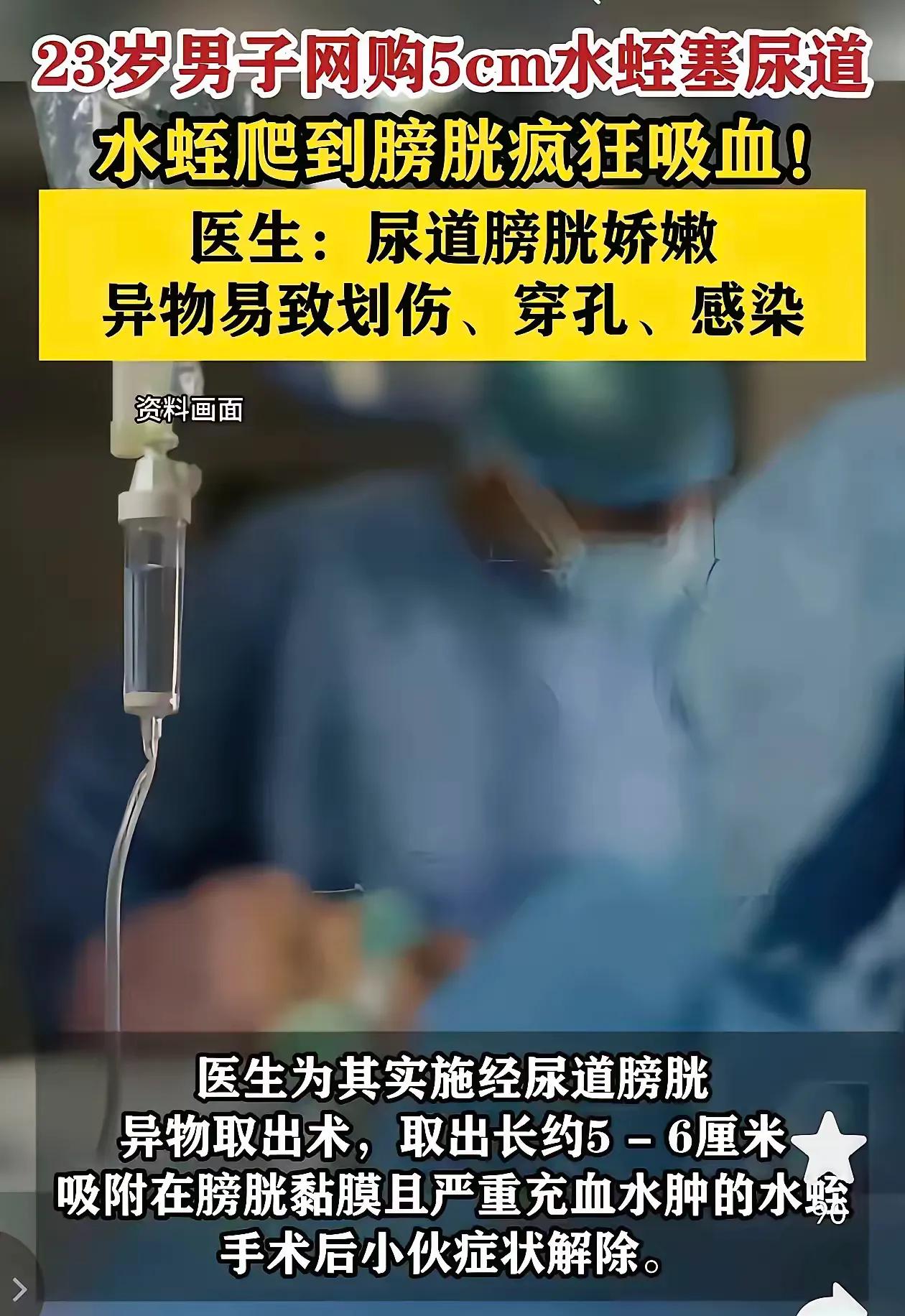 无知真可怕!河南郑州,一23岁男子出于好奇,网购5cm的水蛭塞入尿道,很快腹痛难忍,排尿困难,水蛭爬到膀胱疯狂吸血释放凝血物质,幸亏去医院及时取出,不然后果不堪设想。 这位23岁的小伙小郑,就因为一时的猎奇心,把网购来的5厘米活体水蛭当成了“新奇玩具”,做出了这种拿自己身体开玩笑的事。水蛭这东西本身是靠吸血为生的,而且身体特别滑腻,一旦进入尿道这种狭窄又湿润的通道,只会一个劲地往深处钻,根本不可能乖乖待在原地。 等小郑感觉到疼的时候,水蛭早就顺着尿道爬到了膀胱里,开始肆无忌惮地吸血,还释放出抗凝血的物质。这就意味着,不光是被吸血的地方会一直出血,膀胱和尿道的黏膜还会被水蛭的吸盘和身体划伤,那种疼可不是普通的肚子疼,是钻心的、让人直不起腰的疼,连正常排尿都成了奢望。要不是他赶紧往医院跑,再晚一点,水蛭可能会把膀胱黏膜咬出更大的伤口,甚至引发严重的感染,到时候别说只是腹痛,搞不好还会影响到泌尿系统的正常功能,留下终身的后遗症。 医院的医生接诊时都直呼离谱,最后通过经尿道膀胱异物取出术,才把那只已经吸得圆滚滚、还在蠕动的水蛭取了出来。从医生的话里也能听出来,往尿道里塞异物的情况其实不是个例,大多都是年轻人因为好奇,或者抱着些不健康的想法瞎折腾,可他们压根没意识到,尿道和膀胱的黏膜比纸还娇贵,随便塞个异物进去,轻则划伤出血、引发炎症,重则可能导致尿道穿孔、膀胱破裂,甚至让细菌趁虚而入,引发全身性的感染,真就是拿命赌一时的新鲜感。 好奇本是人之常情,但这份好奇得用在正经地方,不能往自己的身体上“试险”。身体的每个器官都有自己的功能和脆弱性,尿道、膀胱这些私密又娇嫩的部位,更是容不得半点胡乱折腾。网购活体水蛭本身就有风险,更别说把它塞进体内,这已经不是简单的“好奇”,而是对自己身体的极度不负责。 不管是出于什么想法,都得记住,身体不是试验品,别让一时的脑抽,换来一辈子的后悔。 各位读者你们怎么看?欢迎在评论区讨论。
