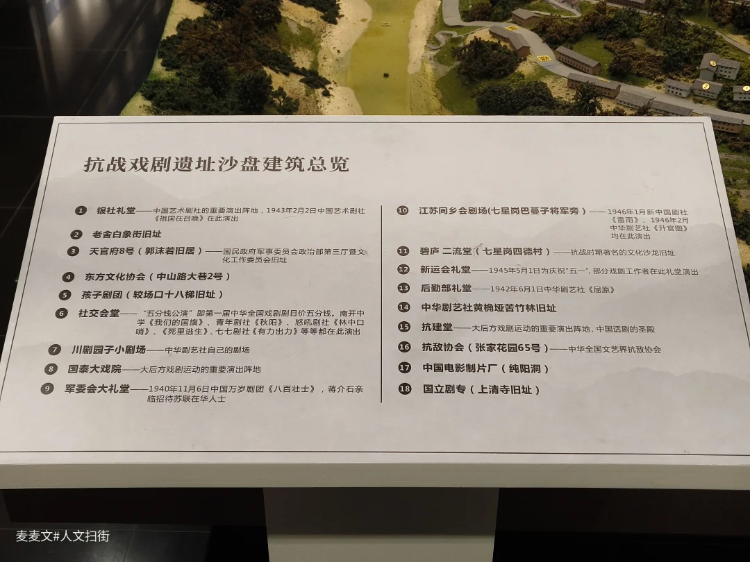在重庆抗建堂的底层,居然藏着一段热血沸腾的话剧史!这里就是中国话剧的黄金岁月——重庆抗战戏剧历史陈列,862.29平方米的空间里,划分出8个主题单元,从抗战戏剧概况、代表团体、名人名剧,到历史成就、精神传承与观演体验,每一处都藏着故事。 没有花哨的布置,却用扎实的文字、泛黄的老照片、带着岁月痕迹的实物,还有逼真的实景模型,把你瞬间拉回那个烽火连天的年代。不用翻厚重的史书,站在这里就能看懂,重庆抗战戏剧如何以笔为刃、以舞台为战场,凝聚起全民族的抗战士气。