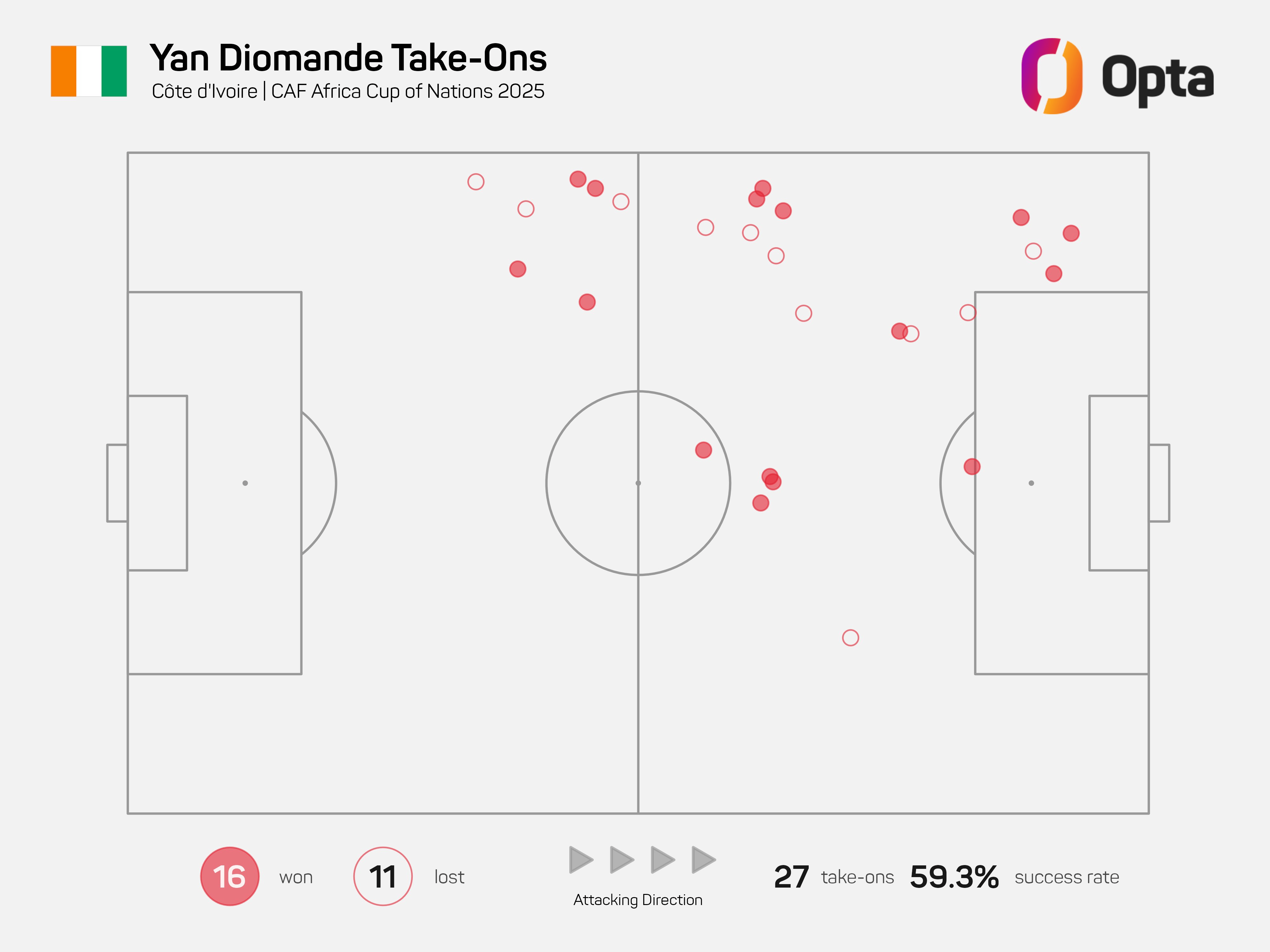 扬-迪奥曼德以16次成功的过人(尝试27次,过人成功率59%)领跑2025年非洲杯过人榜。