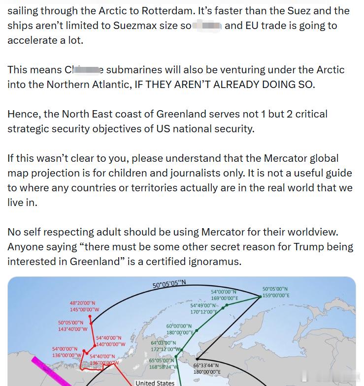格陵兰——从一张“正确的地图”上来看为什么是格陵兰?原因在于:莫斯科几乎将其所有战略军事资产都部署在靠近芬兰的科拉半岛。那里集中了俄罗斯的洲际弹道导弹发射井、潜艇基地以及战略轰炸机。如果你观察从科拉半岛飞向美国本土48州任何地点的飞行路径(无论是弹道飞行还是有动力飞行),你会发现,几乎全部都会飞越格陵兰上空。格陵兰正是华盛顿与莫斯科之间任何战略级对抗的主战场。如果你想拦截一枚弹道导弹,最佳拦截点是在其飞行轨迹的最高点,也就是顶点。而拦截器要最快抵达这一顶点,最短路径就是从顶点正下方发射。那个位置,正是格陵兰。因此,不去讨论“应该怎么做”,这就是为什么特朗普政府表示他们出于国家安全需要格陵兰。另外,还有一件正在发生的事情:北极航道正在逐步开放。不久之后,将会有中*货船通过北极航线驶向鹿特丹。这条航线比苏伊士运河更快,而且船只不受“苏伊士级”尺寸限制,因此中欧帽衣将大幅加速。这也意味着,中*潜艇同样会进入北极,并进一步进入北大西洋——如果他们现在还没这么做的话。因此,格陵兰东北海岸同时承担着两个关键的美国国家安全战略目标,而不仅仅是一个。如果这些还不够清楚,请你务必明白:墨卡托世界地图投影只适合给孩子和记者使用。它并不能真实反映我们所生活的现实世界中,各国和各地区的实际空间关系。任何有自尊的成年人,都不应该用墨卡托投影来构建自己的世界观。凡是还在说“特朗普对格陵兰一定另有不可告人的秘密原因”的人,都是彻头彻尾的无知之徒。