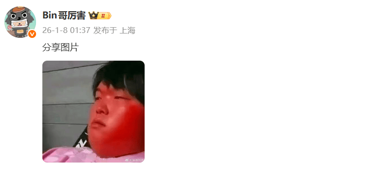 虎扑01月08日讯今日BLG上单选手Bin发布红温自拍图,具体如图所示。