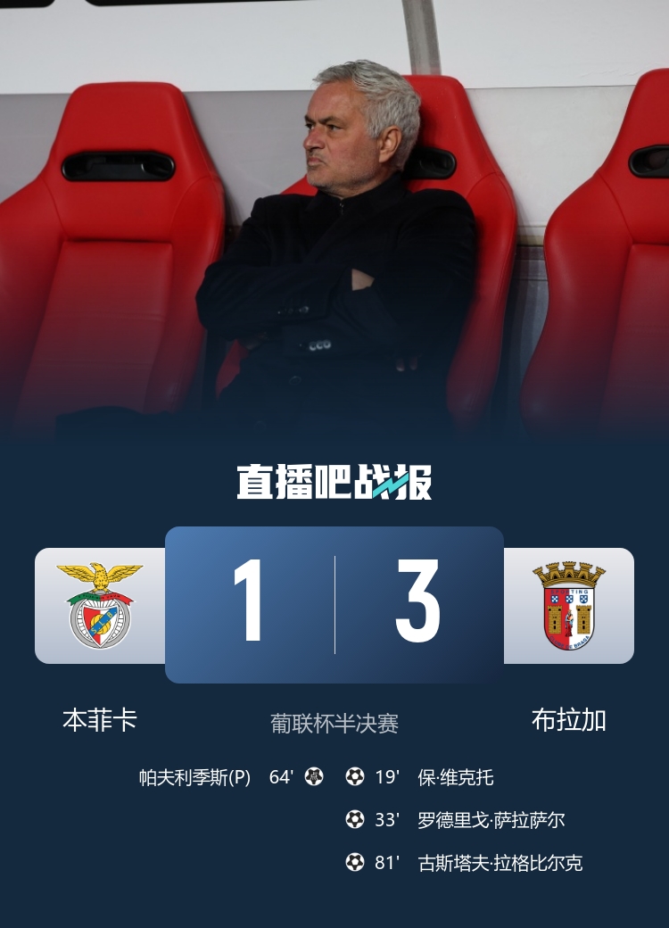 直播吧01月08日讯北京时间1月8日凌晨4:00,葡超杯半决赛在马加良斯佩索阿博士球场打响,本菲卡对阵布拉加。上半场保·维克托首开记录,萨拉萨尔破门完成传射,半场布拉加2-0领先本菲卡。下半场,帕夫利季斯点射扳回一城,古斯塔夫·拉格比尔克再次扩大比分,第89分钟奥塔门迪两黄变一红被罚下。最终本菲卡1-3布拉加无缘葡超杯决赛,布拉加决赛将对阵吉马良斯。
