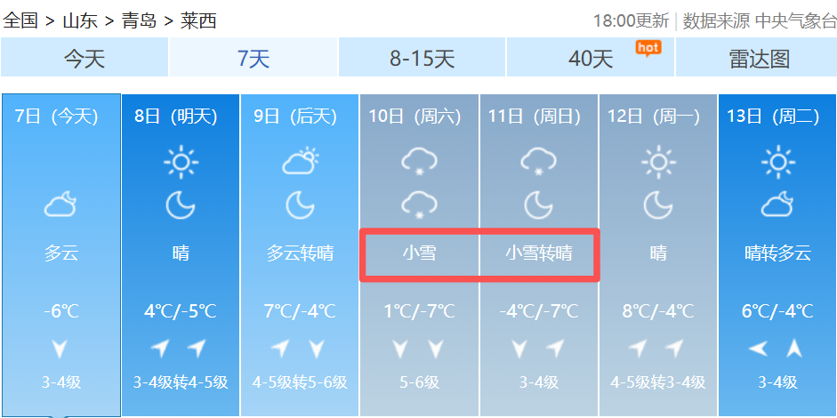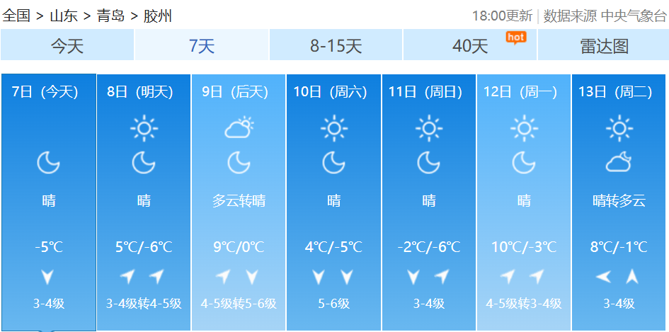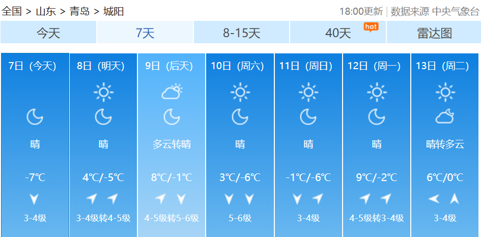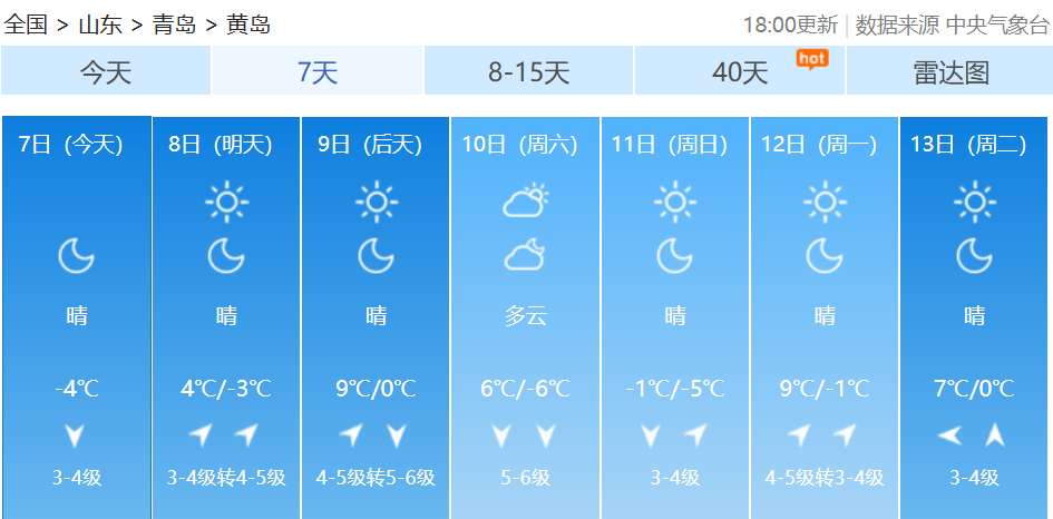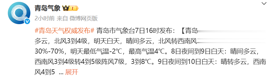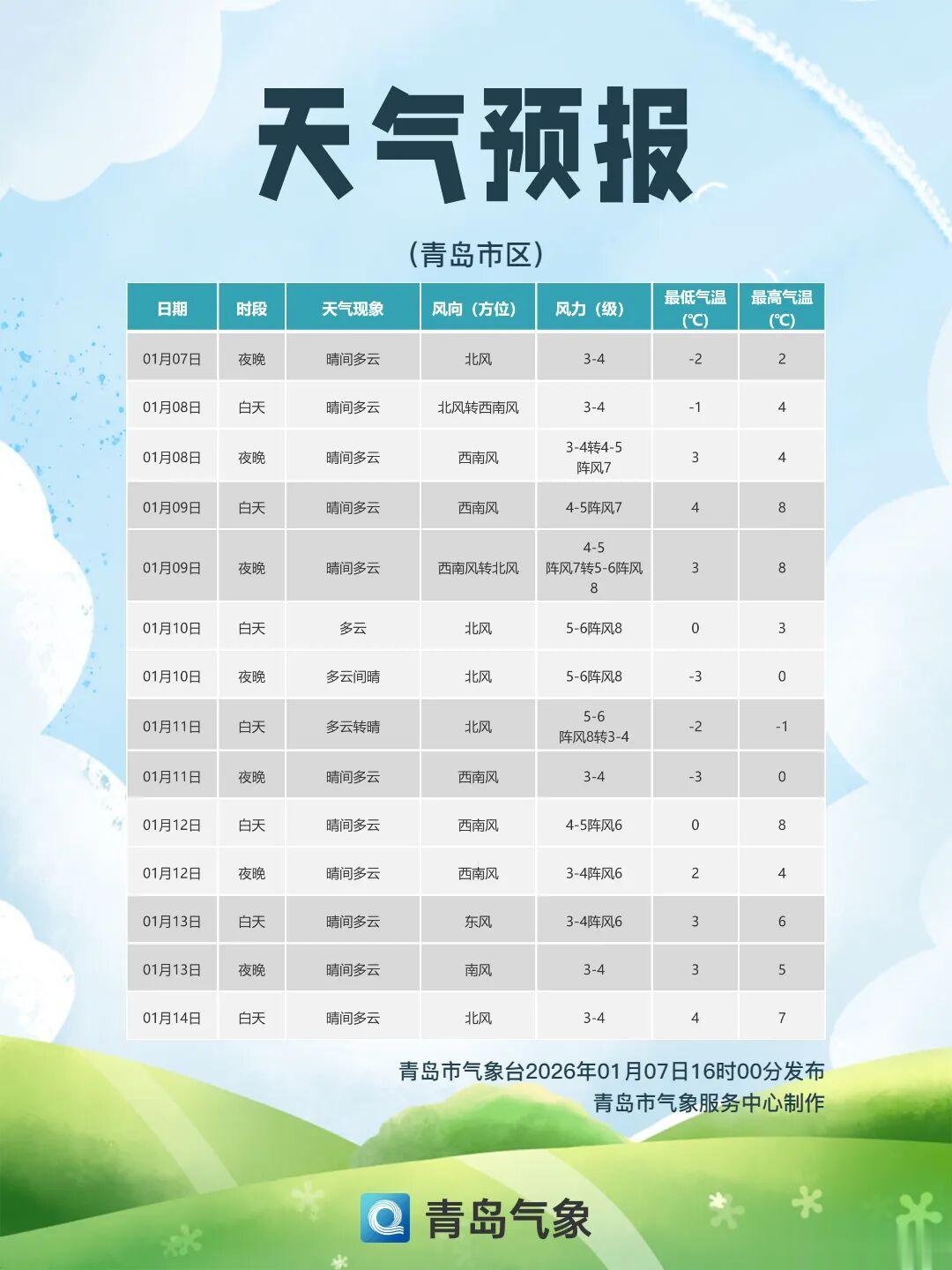 [青岛市区]8日白天,晴间多云,北风转西南风3到4级,相对湿度30%~70%,8日最低气温-2℃,最高气温4℃。