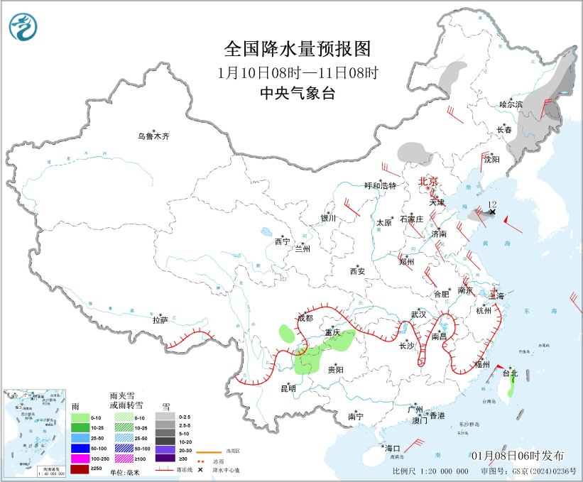 图2全国降水量预报图(1月9日08时-10日08时)