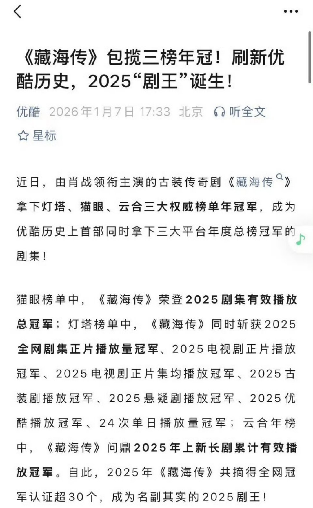 肖战藏海传上星实绩 肖战藏海传上星实绩来了,收视中国来发战报了,《藏海传》三星联播第一,优酷也发战报了,《藏海传》是包揽灯塔、云合、猫眼的三榜年冠,刷新优酷历史,真的太牛了