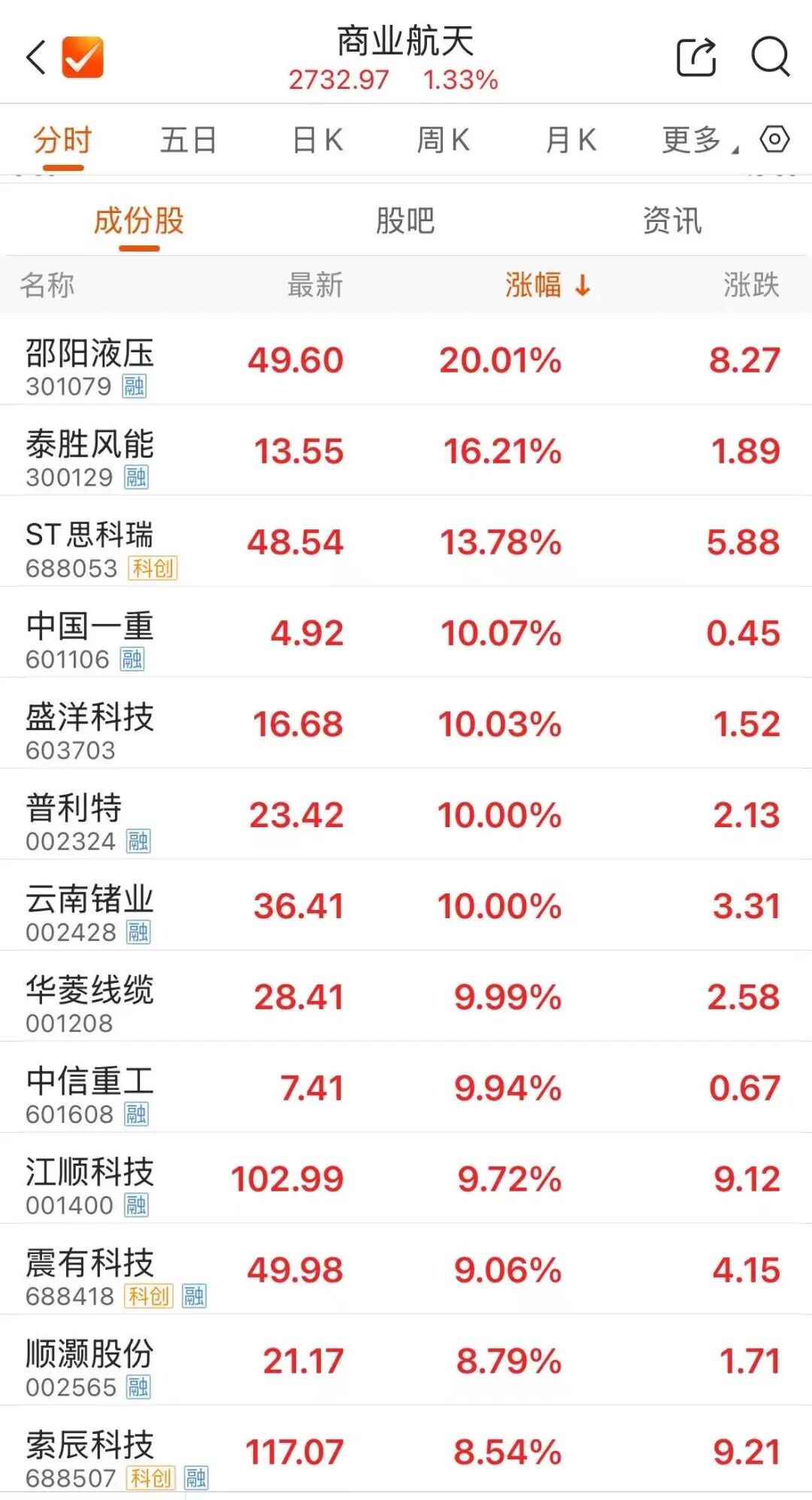 商业航天板块早盘活跃,邵阳液压、中国一重、盛洋科技等多只个股涨停,泰胜风能涨超15%。