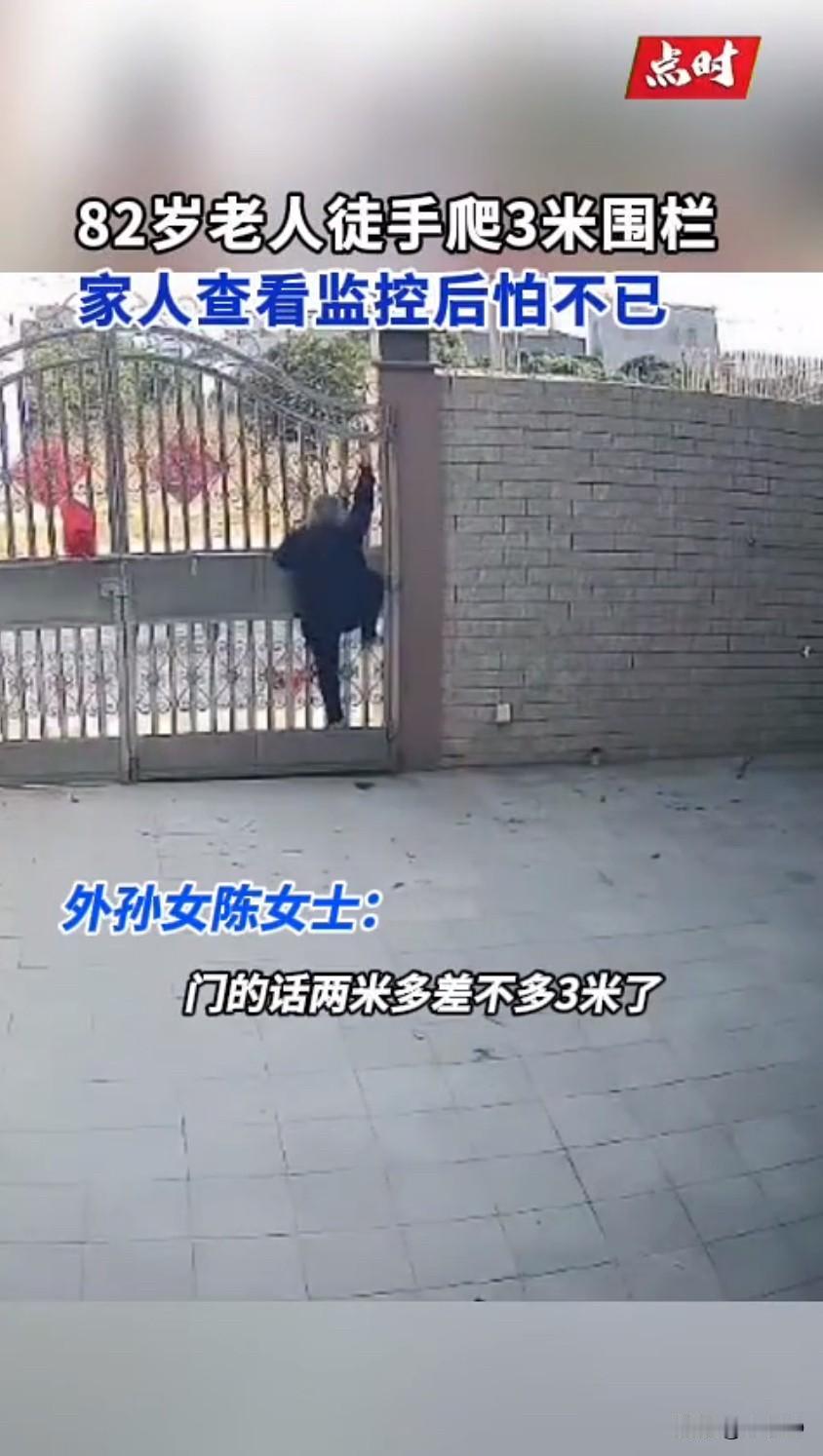 广东汕尾一位82岁外婆的“硬核操作”,让全网都替她捏了把汗!82岁外婆翻3米高围栏出门 女子回应82岁外婆4次翻3米大门 这两个话题一冲上热搜,网友们都惊呼“奶奶这身手也太绝了,年轻人都未必能做到”。 事情是外孙女陈女士发视频曝光的,她在家查监控时,意外发现外婆趁家里没人,居然徒手攀爬近3米高的围栏出门。监控里的画面看着都揪心:外婆先是走到院子大门前,尝试开门没打开,转头就盯上了旁边的围栏。只见她双手紧紧抓住围栏边缘,脚踩着栏杆缝隙,慢慢往上蹬,动作虽然不算快,但每一步都很稳,最后居然成功翻到了围栏另一边,落地后还拍了拍身上的灰,一副“小菜一碟”的模样。 陈女士说,外婆平时走路都不太利索,看到这一幕时直接吓傻了,后来问了维修大门的师傅才知道,外婆这已经是第4次翻围栏了。原来家里的大门因为下雨生锈,开关很不方便,外婆想出门却打不开门,就想出了翻围栏这个“绝招”。之前家人根本没察觉,直到这次查监控才发现,一想到3米高的围栏,老人万一没抓稳摔下来,后果不堪设想,全家都惊出一身冷汗。 视频发到网上后,网友们都炸开了锅。有人调侃“外婆这是隐藏的武林高手吧,82岁还能飞檐走壁”,也有人说“关不住,根本关不住,这颗想出去玩的心太热烈了”。但更多人还是担心安全,毕竟这么大年纪,3米高的围栏可不是闹着玩的,老年人骨质疏松,一旦摔倒很可能造成骨折,甚至戳伤内脏,风险特别高。 陈女士也意识到了问题的严重性,赶紧找人维修了生锈的大门,还专门教外婆怎么正确开门,避免她再因为门不好开而冒险翻墙。其实老人之所以这么做,也是出于无奈,大门故障加上着急出门,才让她想出了这种“险招”。这事儿也给不少家庭提了个醒,家里有老人的话,一定要多检查门窗、家具等设施,避免出现类似的安全隐患,同时也要多和老人沟通,教他们遇到问题该怎么正确处理,而不是自己冒险解决。 这事儿也给家里有老人的朋友们提了个醒,平时要多关注老人的需求,比如家里的设施有没有不方便使用的地方,及时维修更换。同时也要多跟老人沟通,告诉他们哪些行为有危险,不能凭着一时兴起冒险。老年人想出门散心是好事,但安全永远是第一位的,可不能用这种惊险的方式“解锁”出行,毕竟家人最在意的,还是老人能平平安安的。八旬外公外婆 来源:点时新闻