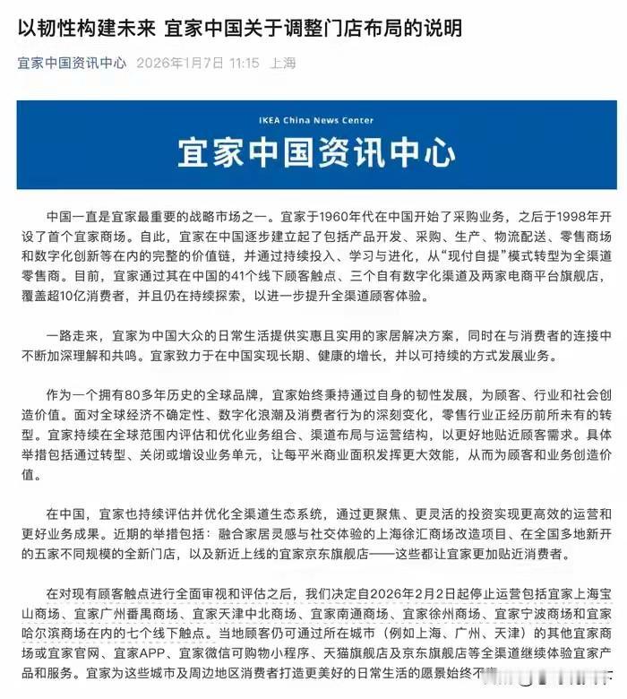 【宜家关店潮背后:三大隐忧击碎“场景霸权”】宜家中国集中关闭7家门店,并非偶然溃败,而是全球标准化模式与中国市场变化脱节的必然结果,三大隐忧已浮出水面。 其一,需求失语的审美困境。曾经风靡的北欧简约风,如今因“安全无个性”被年轻消费者抛弃,国潮、定制化家居成为新主流,而宜家仍依赖全球统一产品线,难以满足自我表达的消费需求。 其二,渠道失灵的效率悖论。远郊大店模式曾是核心优势,但如今消费者更青睐“线上比价+就近购买”,大店高租金、低坪效的短板凸显,部分门店客流被社区店分流。 其三,竞争失位的生态短板。本土品牌凭借全屋定制、7天交付等服务直击痛点,小米、华为等科技企业构建的智能家居生态,更让宜家零散、兼容性弱的智能产品相形见绌。 全球销售额微降1%的背后,是宜家未能将市场变化转化为决策调整。这场关店潮不是“大店时代终结”,而是给所有外资品牌敲响警钟:唯有放下过往成功经验,重构本土化需求响应能力,才能在存量竞争中站稳脚跟。 宜家中国官宣关闭7家店