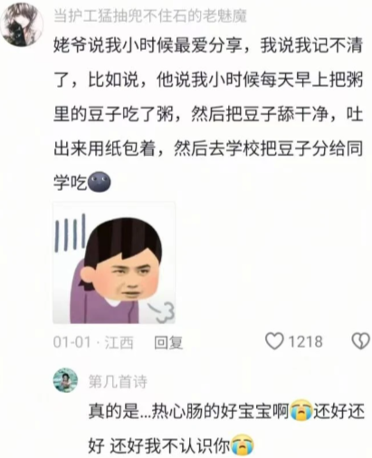 他说我小时候每天早上把粥里的豆子吃了粥,然后把豆子舔干净,吐出来用纸包着,然后去学校把豆子分给同学吃