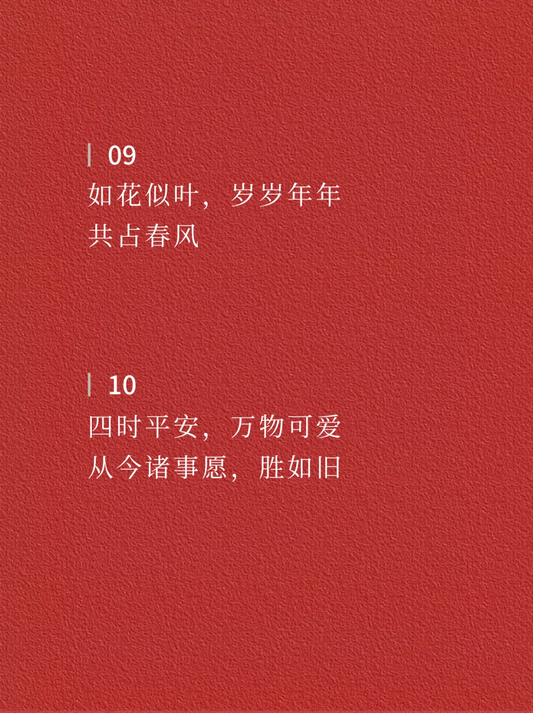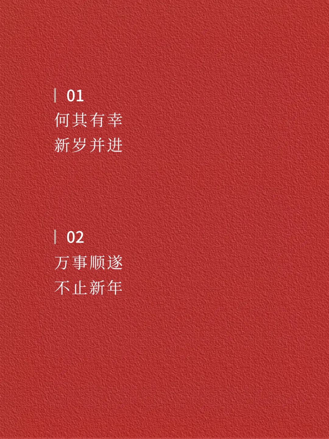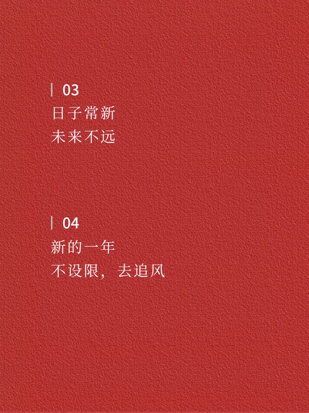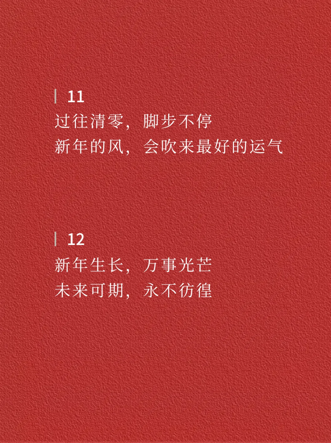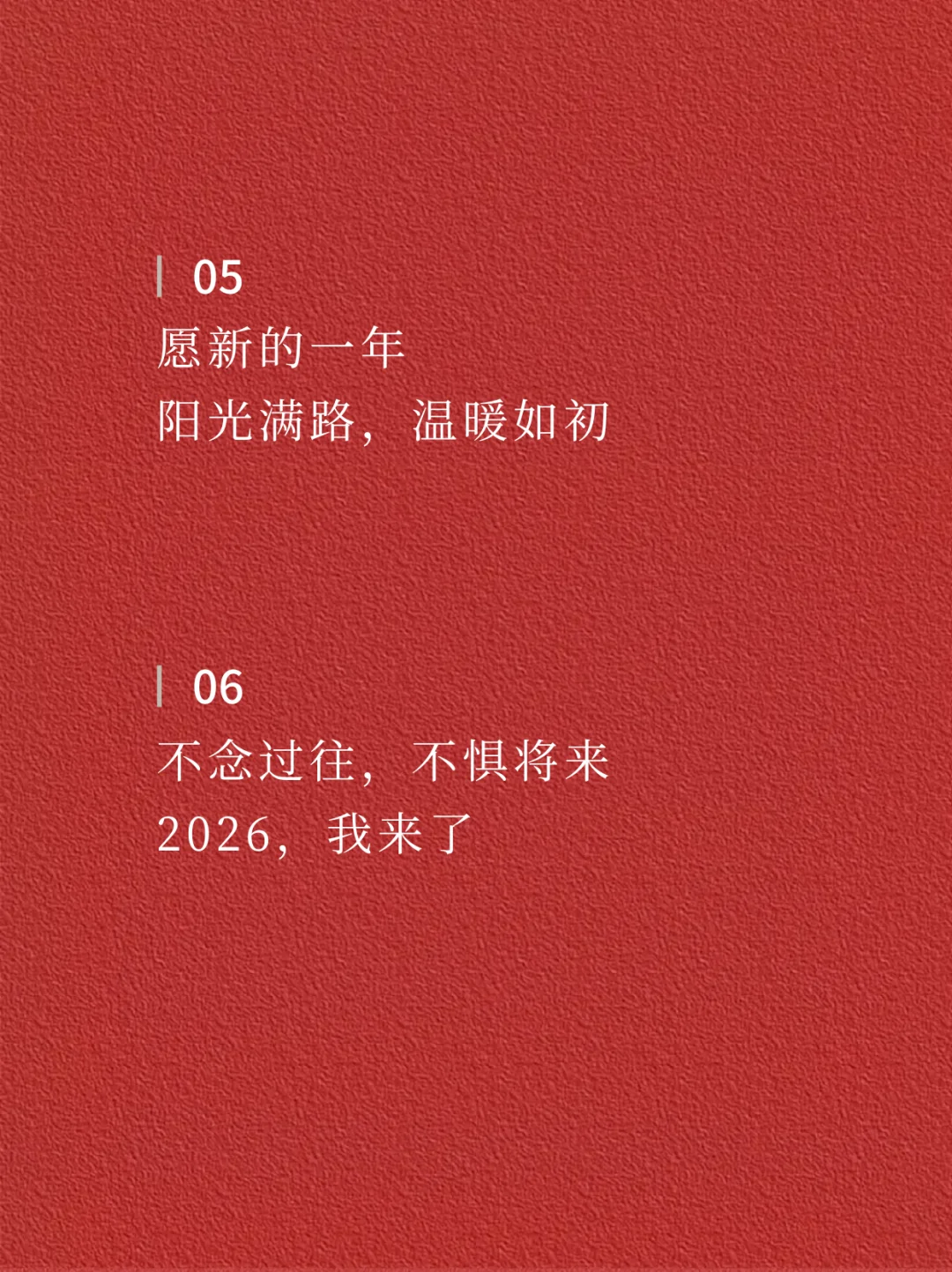 🧣🧣 01 何其有幸 新岁并进 · 02 万事顺遂 不止新年 · 03 日子常新 未来不远 · 04 新的一年 不设限,去追风 · 05 愿新的一年 阳光满路,温暖如初 · 06 不念过往,不惧将来 2026,我来了 · 07 日子常新与胜意 又是一年好四季 · 08 心之所向,步履皆往 以梦为马,腾跃新章 · 09 如花似叶,岁岁年年 共占春风 · 10 四时平安,万物可爱 从今诸事愿,胜如旧 · 11 过往清零,脚步不停 新年的风,会吹来最好的运气 · 12 新年生长,万事光芒 未来可期,永不彷徨 · ✨✨ —The end— 🌈感谢阅读