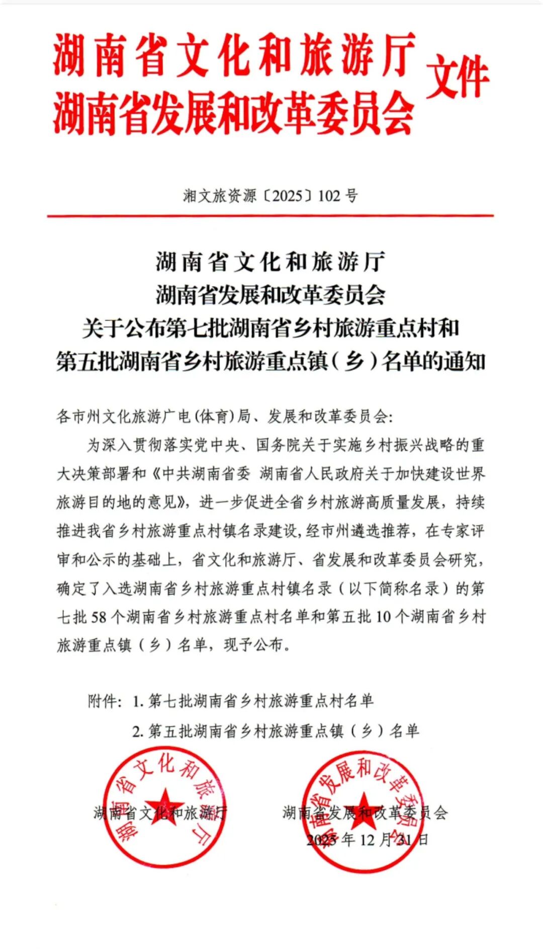 近日,湖南省文化和旅游厅、湖南省发展和改革委员会公布第七批湖南省乡村旅游重点村和第五批湖南省乡村旅游重点镇(乡)名单