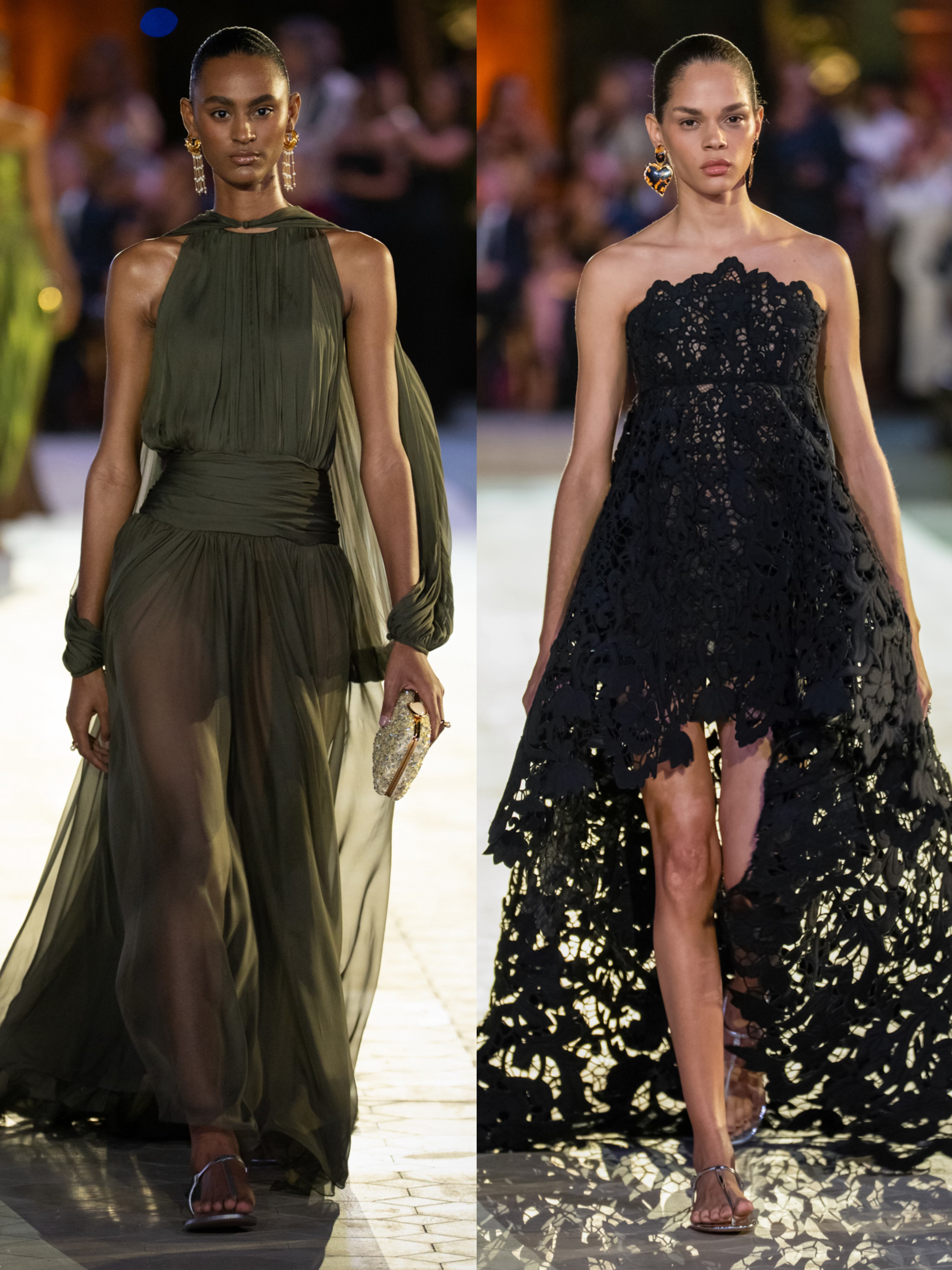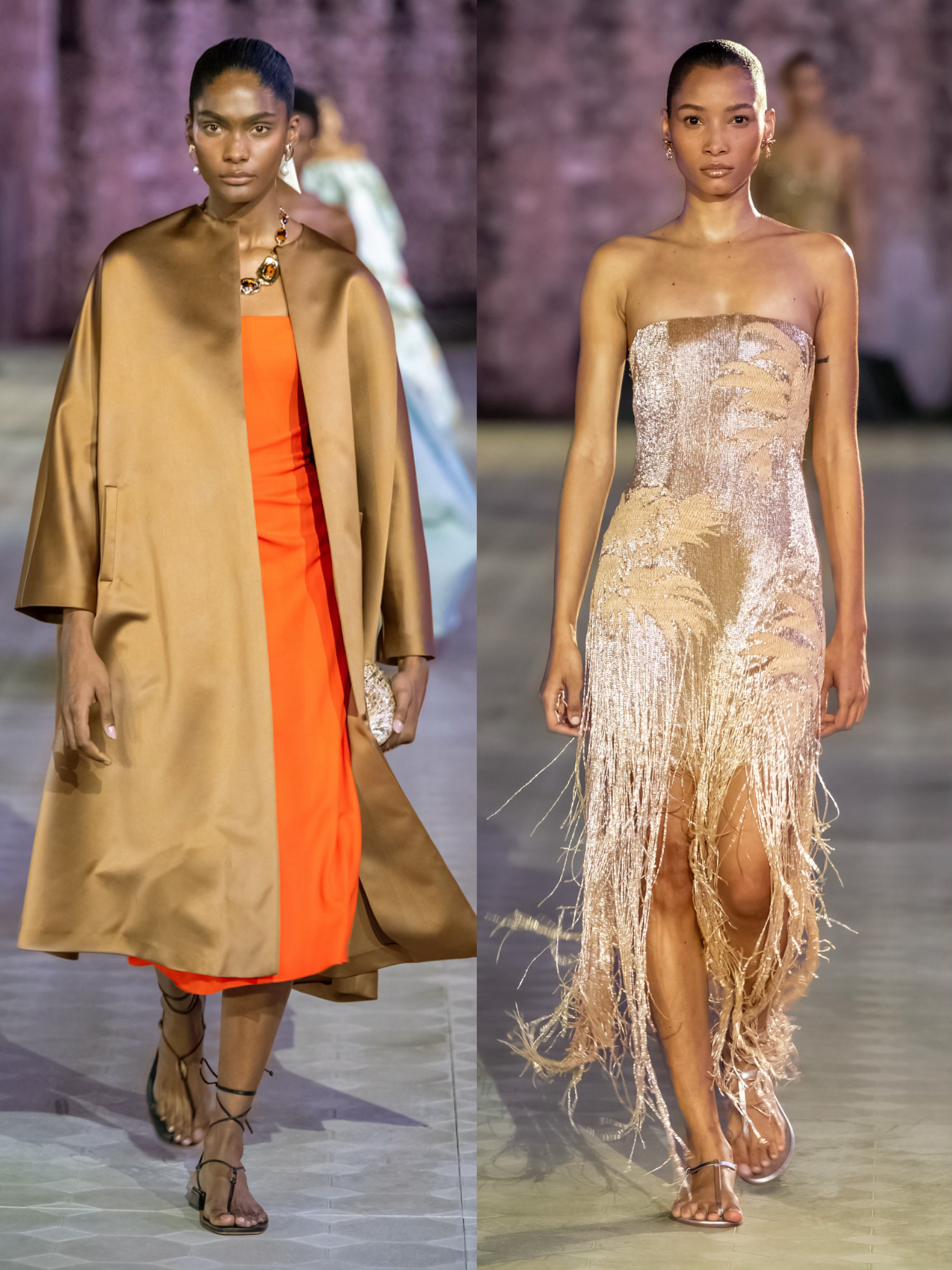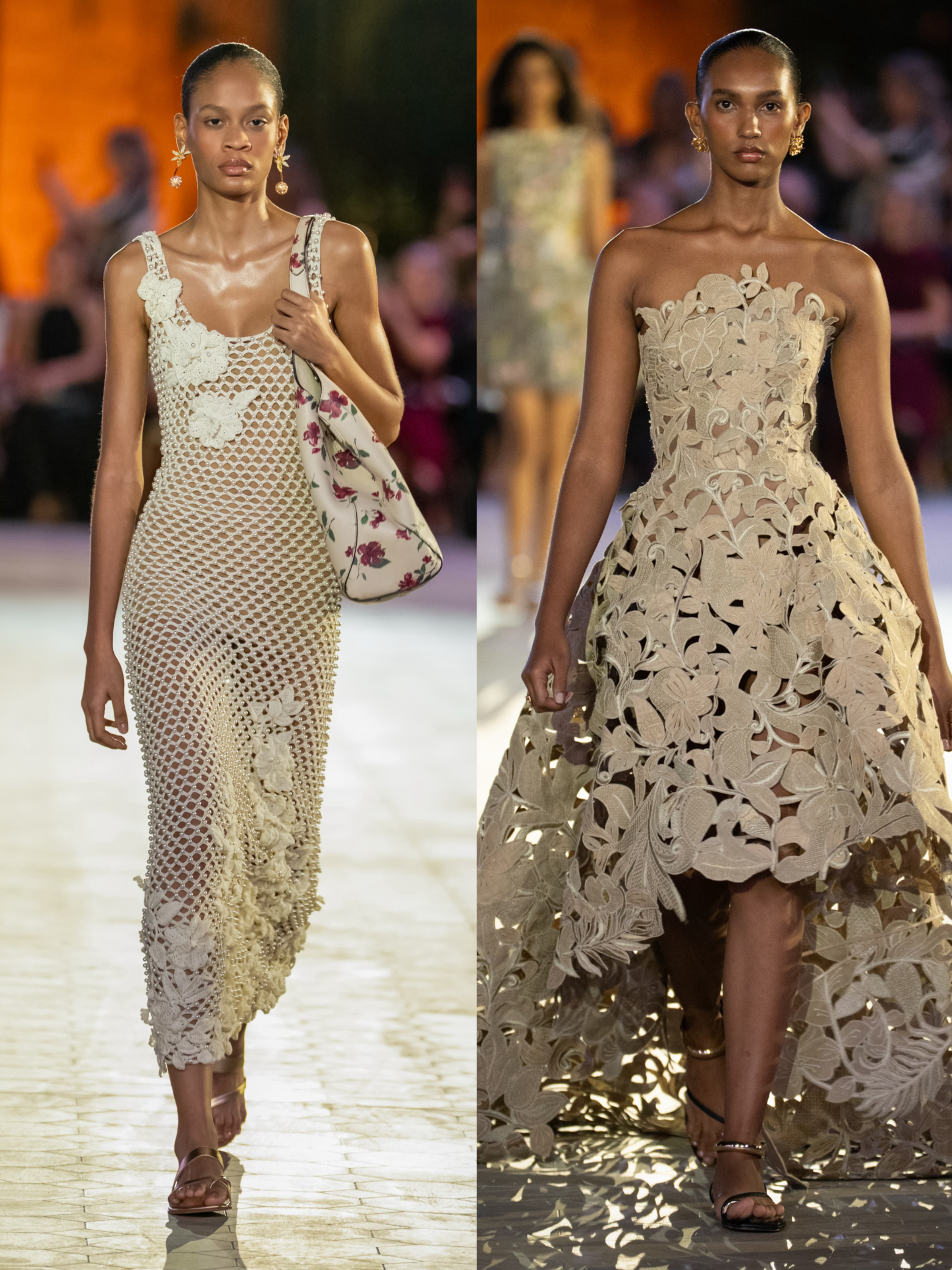 OSCAR DE LA RENTA 2026 早秋系列暨品牌 60 周年纪念大秀🌸🍃———大秀在多米尼加共和国首都圣多明各举行,致敬品牌创始人OSCAR 先生对故士的眷恋和品牌60载非凡传承与隽永美学。全多米尼加阵容模特伴随多米尼加国家交响乐团现场演绎的拉威尔《波莱罗舞曲》旋律依次登场。该系列以丰富多变的印花、材质与刺绣语言,转译多米尼加文化中蕴含的自然之美与欢愉生活气息。极具视觉张力的手绘多米尼加风景贯穿系列,包括历史地标奥萨马堡垒及OSCAR 先生位于蓬塔卡纳的故居,这些图案被呈现于棉质府绸、缎面与针织面料之上。罗望子棕、卡其色与海水蓝等柔和色系,构筑出本系列沉稳质朴的基调。棕桐叶作为本季的核心意象,被赋予多重演绎方式:帆布剪裁面料上晕染出渐变平纹肌理;舒展的叶片印花沿多款廓形自然晕褪;金色立体刺绣叶片则点缀于迷你蛋糕裙与鸡尾酒裙之上。尤为点晴的是,采用拉菲草与管状珠片打造的同色系嵌花棕桐叶纹样,赋予其日晒褪色般的复古质感。风格大赏时尚灵感解读
