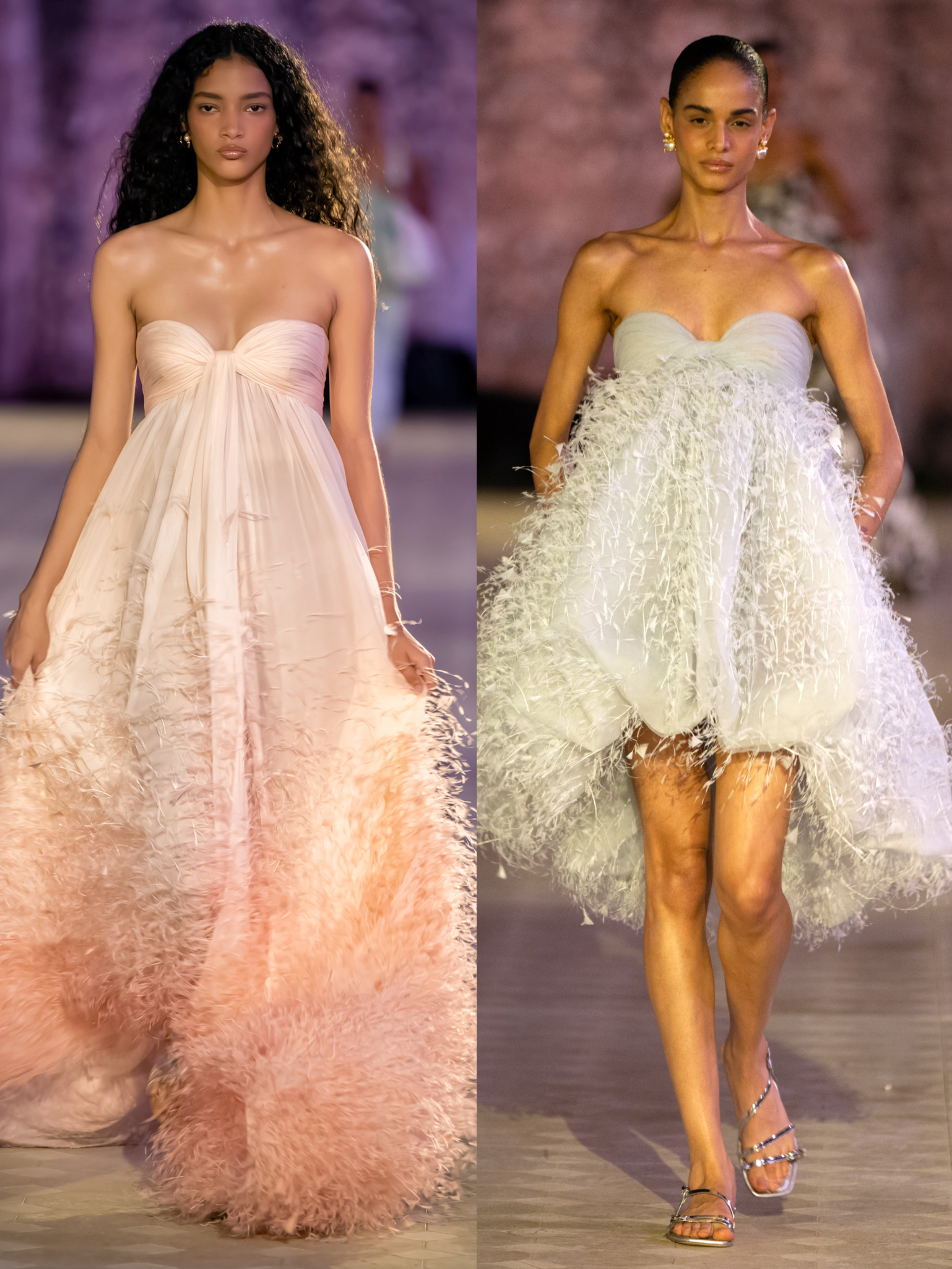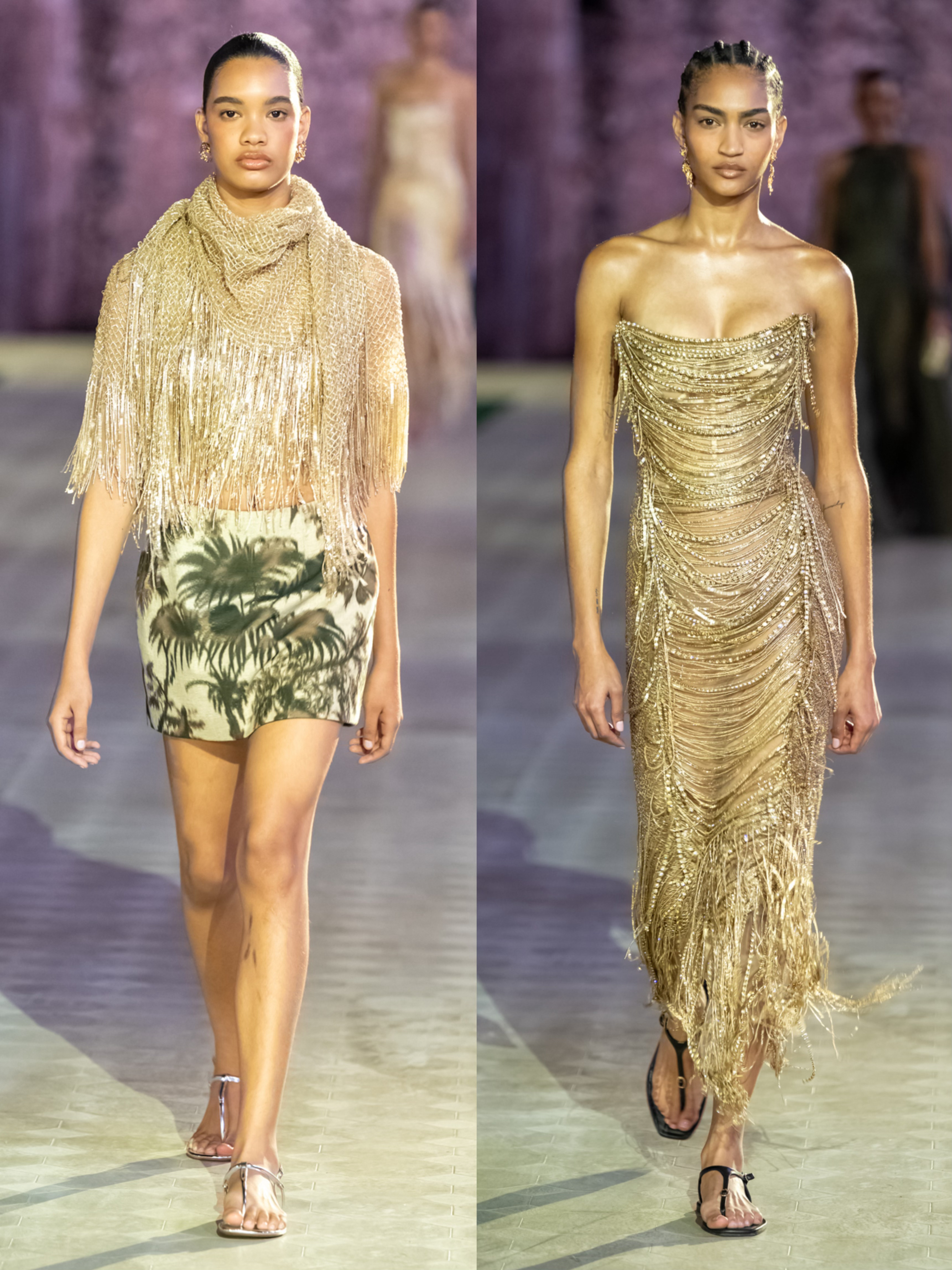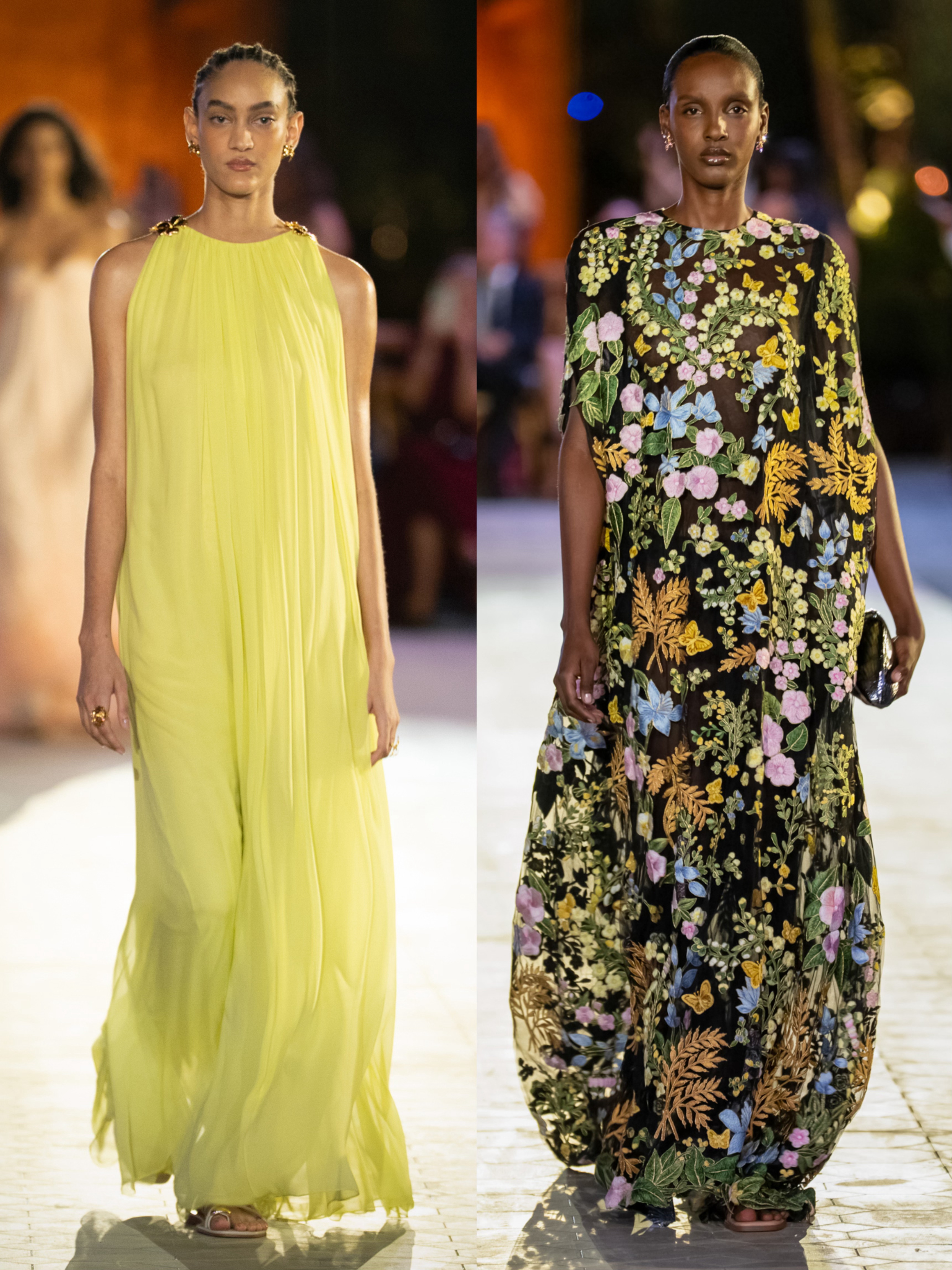 OSCAR DE LA RENTA 2026 早秋系列暨品牌 60 周年纪念大秀🌸🍃———大秀在多米尼加共和国首都圣多明各举行,致敬品牌创始人OSCAR 先生对故士的眷恋和品牌60载非凡传承与隽永美学。全多米尼加阵容模特伴随多米尼加国家交响乐团现场演绎的拉威尔《波莱罗舞曲》旋律依次登场。该系列以丰富多变的印花、材质与刺绣语言,转译多米尼加文化中蕴含的自然之美与欢愉生活气息。极具视觉张力的手绘多米尼加风景贯穿系列,包括历史地标奥萨马堡垒及OSCAR 先生位于蓬塔卡纳的故居,这些图案被呈现于棉质府绸、缎面与针织面料之上。罗望子棕、卡其色与海水蓝等柔和色系,构筑出本系列沉稳质朴的基调。棕桐叶作为本季的核心意象,被赋予多重演绎方式:帆布剪裁面料上晕染出渐变平纹肌理;舒展的叶片印花沿多款廓形自然晕褪;金色立体刺绣叶片则点缀于迷你蛋糕裙与鸡尾酒裙之上。尤为点晴的是,采用拉菲草与管状珠片打造的同色系嵌花棕桐叶纹样,赋予其日晒褪色般的复古质感。风格大赏时尚灵感解读