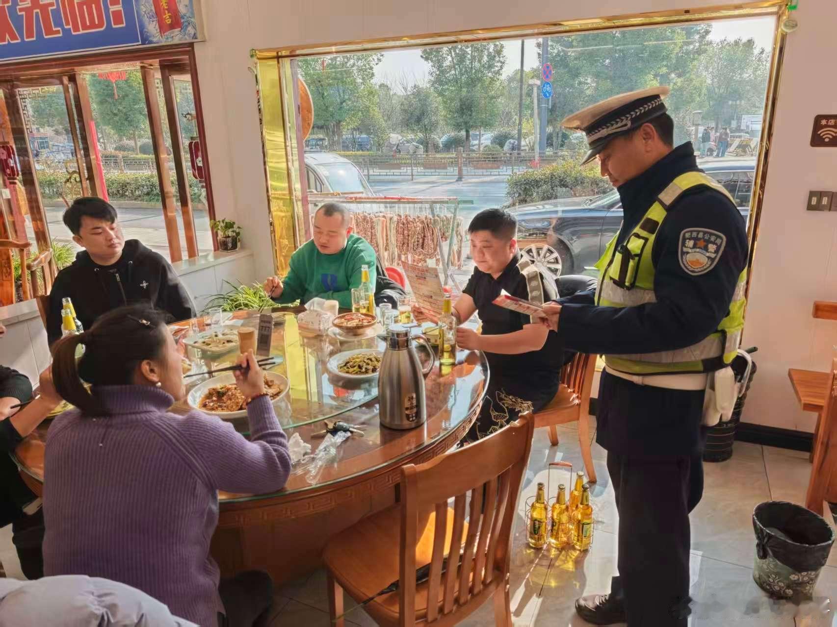 【餐馆里的“安全提醒”!合肥肥西交警把酒驾警示送到酒桌前】为从源头遏制酒醉驾违法