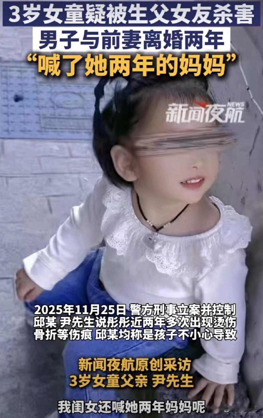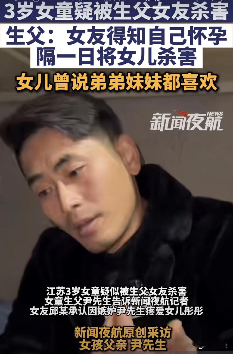 1月8日3岁女童疑被生父女友杀害,生父:女友得知自己怀孕,隔一日将女儿杀害,女儿曾说弟弟妹妹都喜欢。 想不明白,杀人不要付出代价吗?难道感觉自己不会受到惩罚吗?成年人的世界为什么让一个3岁娃买单! 因为自己怀了男友的孩子,就要杀死男友与前妻的孩子,什么逻辑?都赶上短剧了,是有成千上亿的资产继承吗?这个失去女儿的父亲,看人的眼光太差劲了,找了一个毒妇呀! 愿天堂没有杀戮,我要控制我自己, 心痛得无法呼吸。眼睁睁的看着你, 任你消失在世界的尽头!就向流星许个心愿让你知道有人爱你!