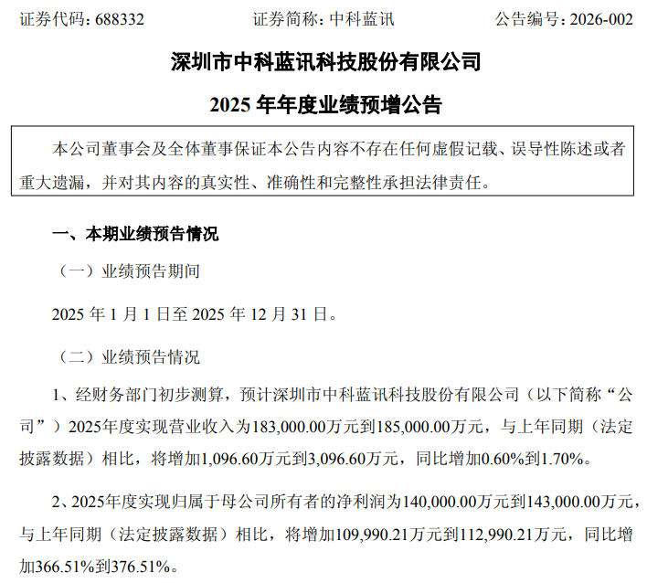 1月7日晚间,深圳市中科蓝讯科技股份有限公司(688332.SH,下称中科蓝讯)发布2025年年度业绩预增公告,预计2025年度实现营业收入18.3亿元至18.5亿元,同比增长0.60%至1.70%;实现归属于母公司所有者的净利润14亿元至14.3亿元,同比大幅增长366.51%至376.51%。