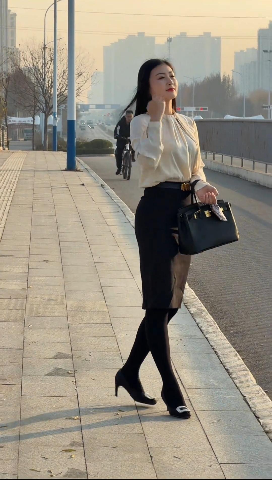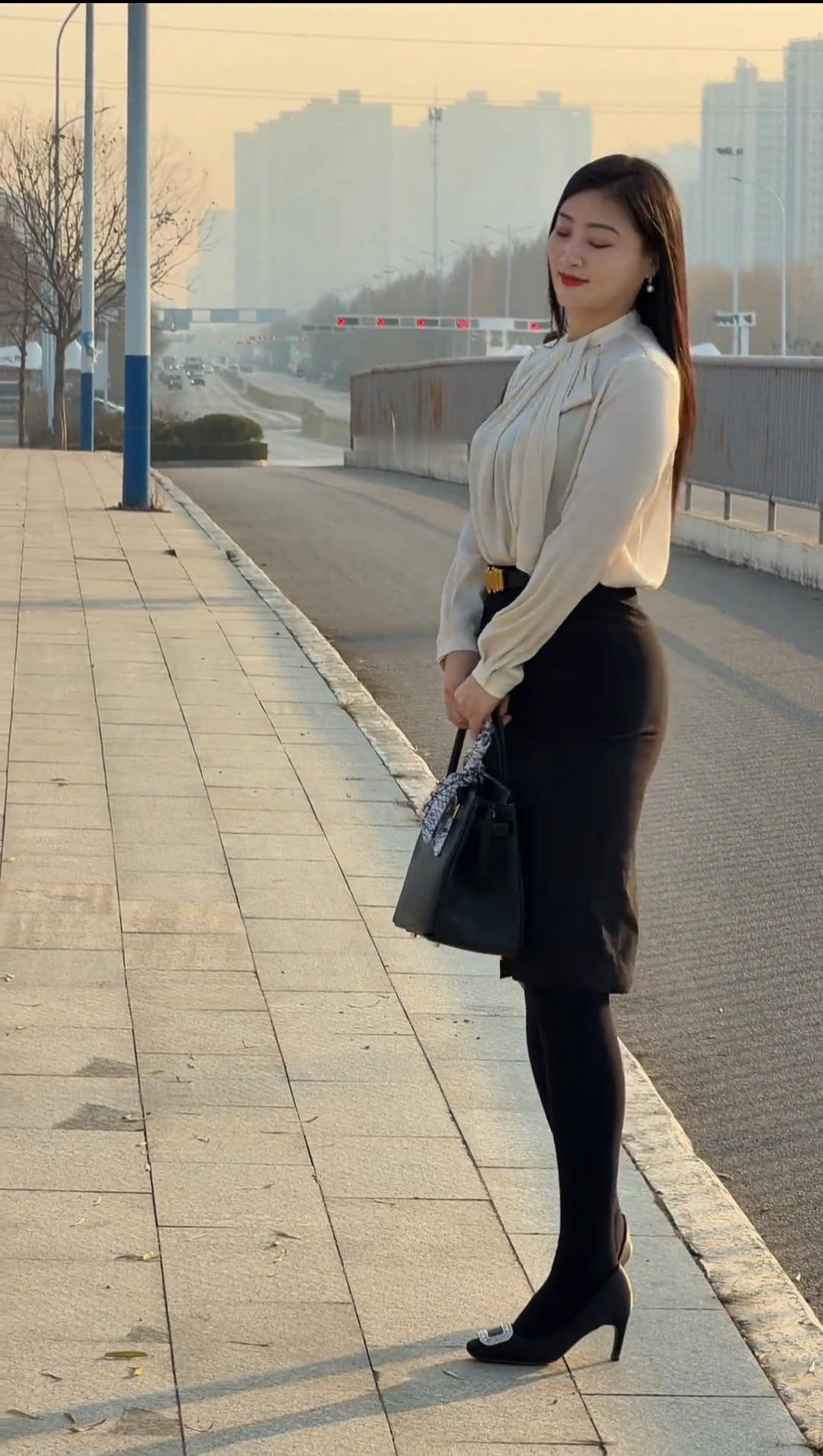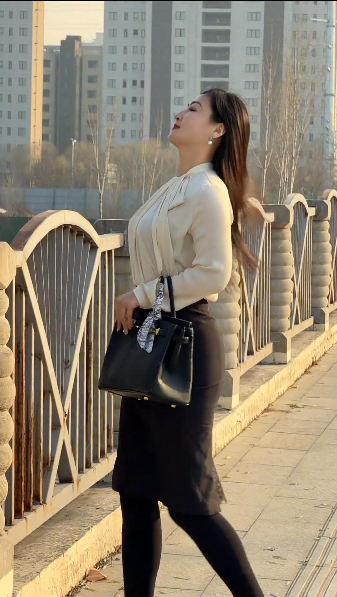 职场穿搭邂逅黄昏浪漫。 当都市的晚风吹起发梢,浅杏色衬衫的温柔邂逅黑色裙装的利