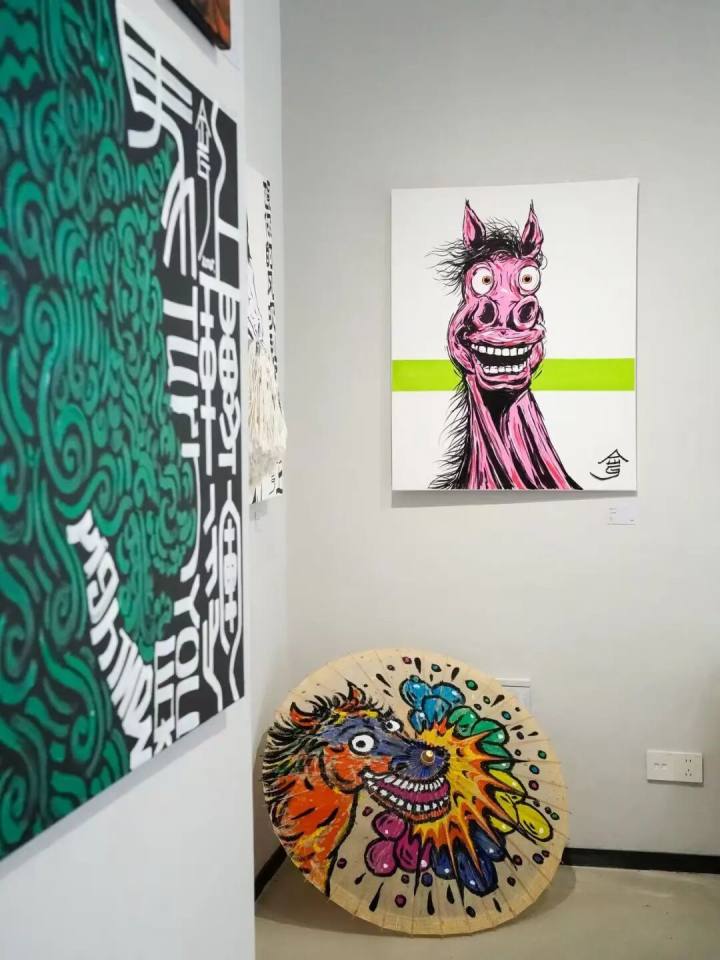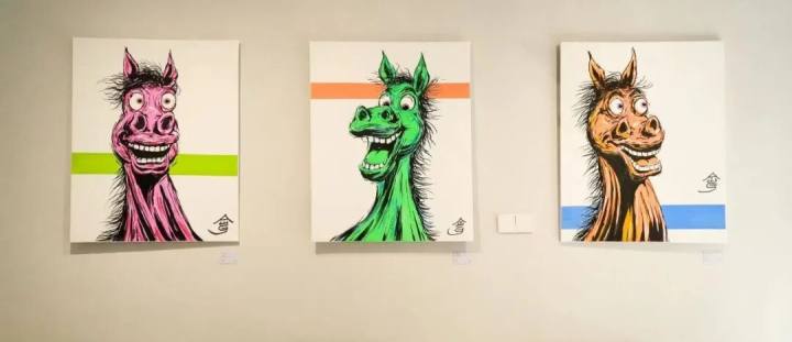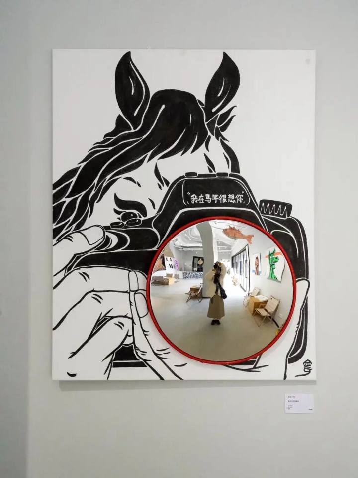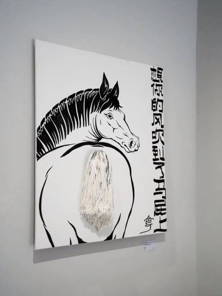 有匹马干脆用屁股对着观众,尾巴是用拖把布做的,仿佛从画里甩了出来。一看图上的标题,原来是“想你的风吹到了马屁上”。