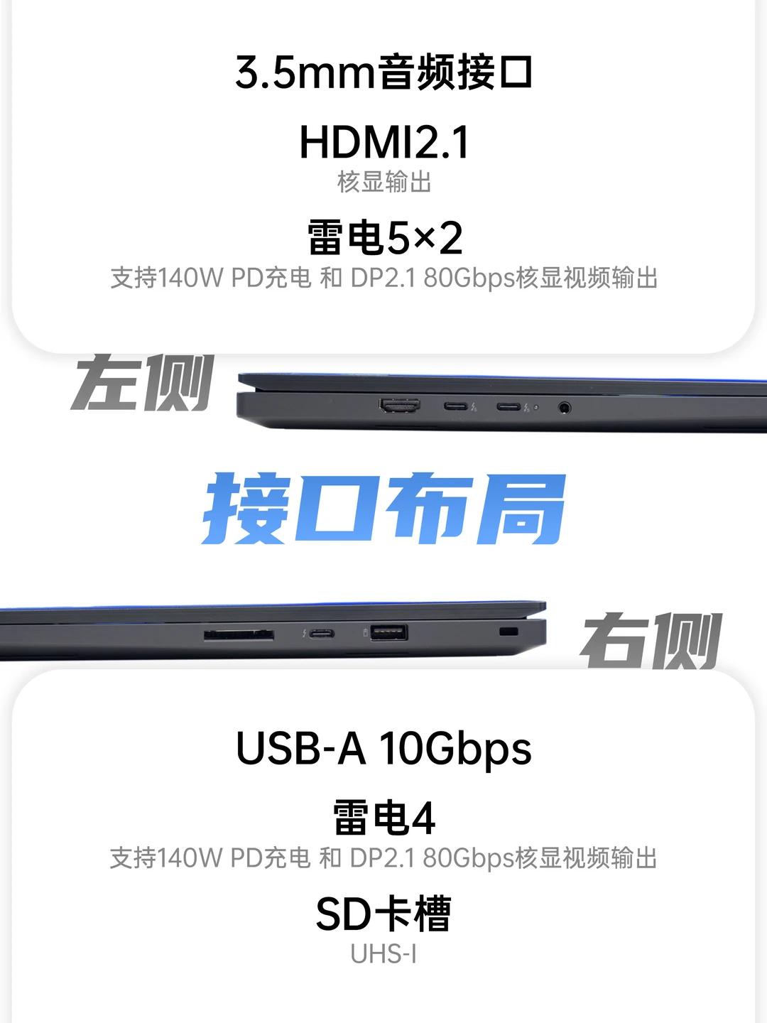 ✅搭载双雷电5+单雷电4,均支持140W PD充电