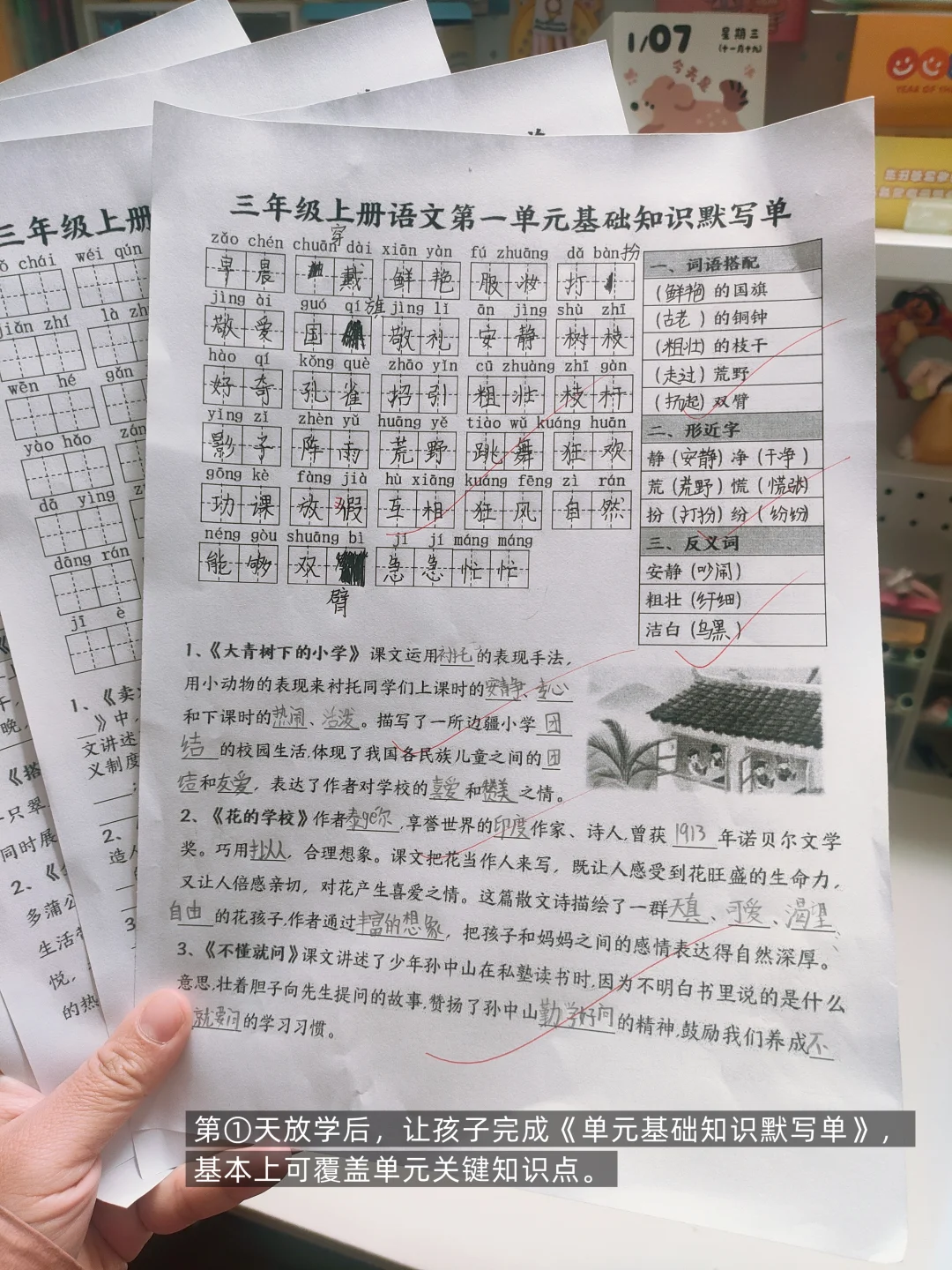 3️⃣第①天放学后,让孩子完成《单元基础知识默写单》,基本上可覆盖单元关键知识点。