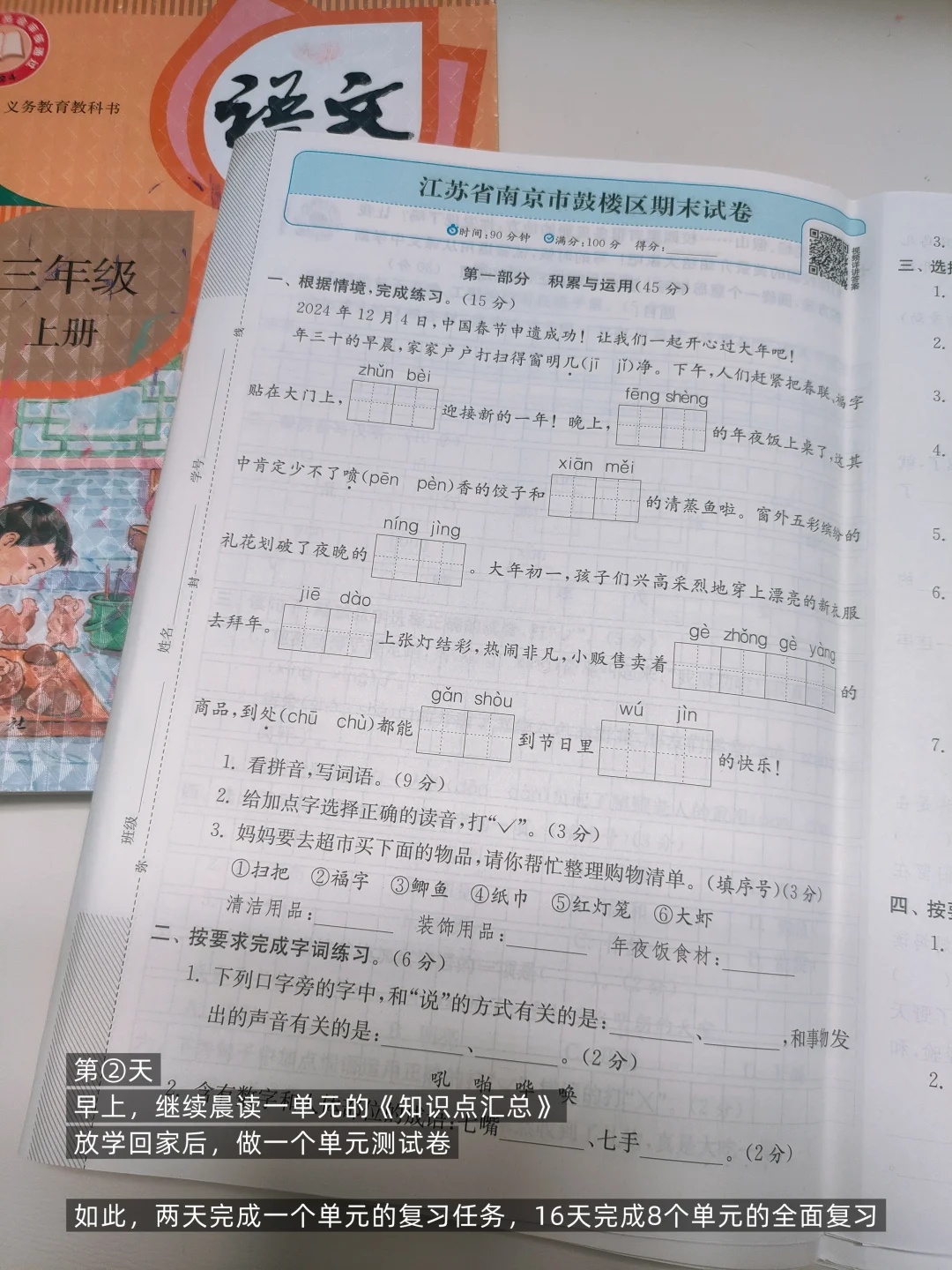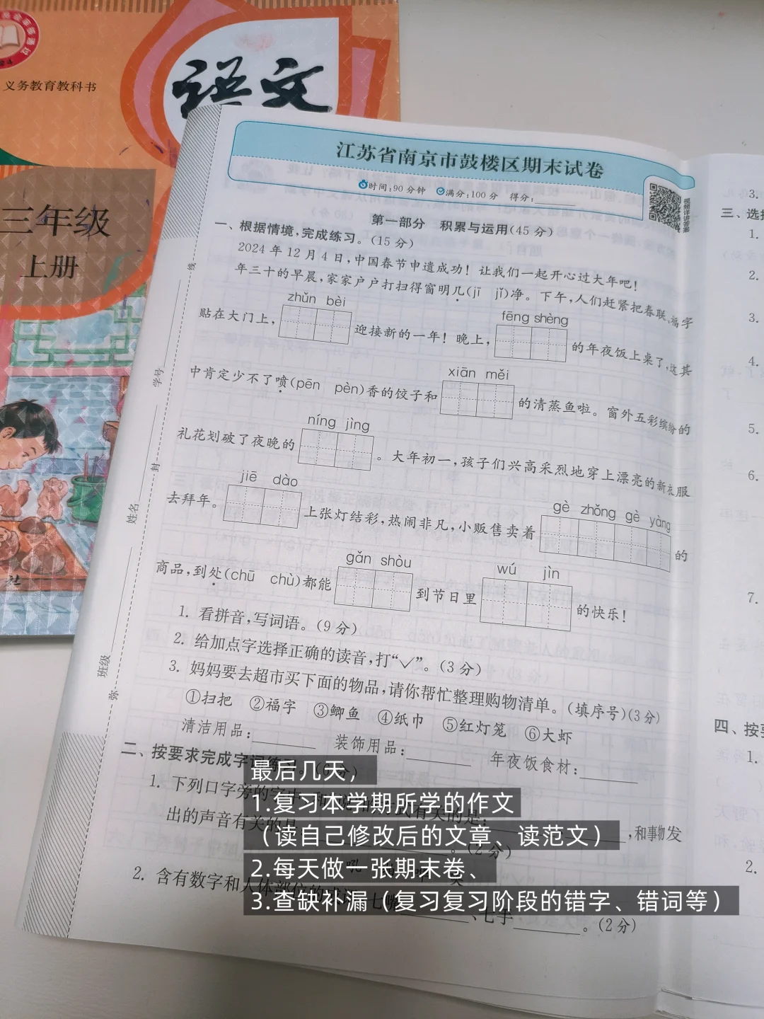 [四R].最后几天复习本学期所学的作文(读自己修改后的文章、读范文)、每天做一张期末卷、查缺补漏(复习复习阶段的错字、错词等)